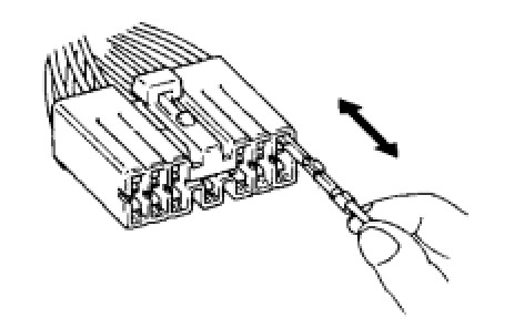 (2) Checking when a connector is disconnected: Check by pulling the wire harness lightly from the backside of the connector. Look for unlatched terminals, missing terminals, loose crimps or broken conductor wires. Check visually for corrosion, metallic or foreign matter and water, and bent, rusted, overheated, contaminated, or deformed terminals.