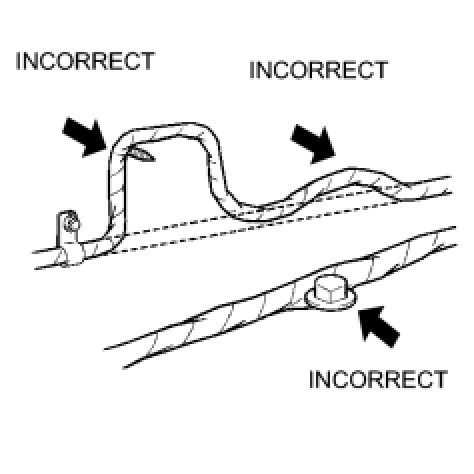 (3) The wire harness should never come into contact with any high temperature part, rotating, moving, vibrating, or sharp-edged parts. Avoid contact with panel edges, screw tips and other sharp items.