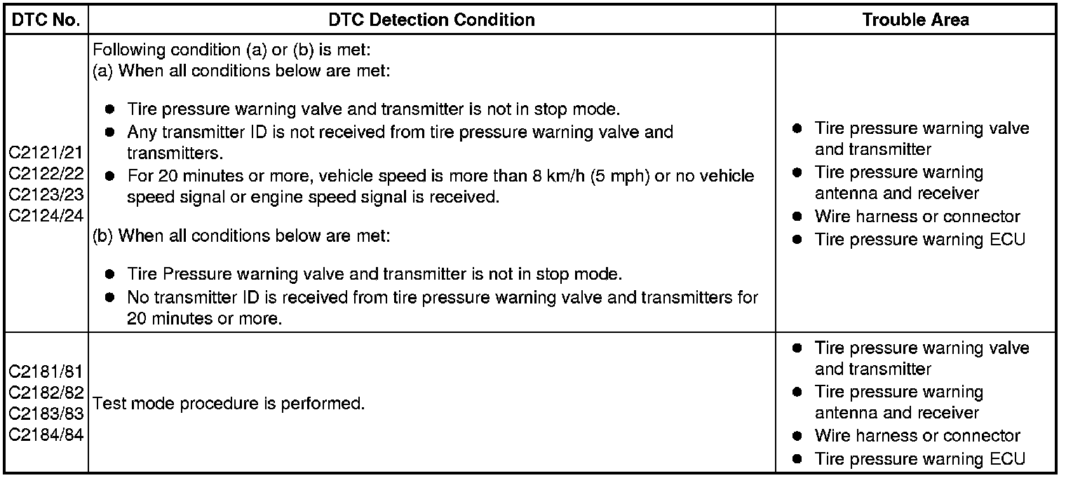 When a transmitter ID is not received from a tire pressure warning valve and transmitter for a total of 20 minutes while the vehicle speed is over 8 km/h (5 mph) or no transmitter ID is received from all of the tire pressure warning valve and transmitters for a total of 20 minutes, DTCs are set.