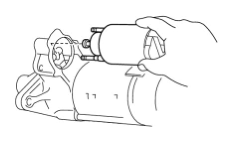 (c) Pull the magnet starter switch assembly, and while lifting the front part of the magnet starter switch assembly, release the plunger hook from the drive lever and magnet starter switch assembly.