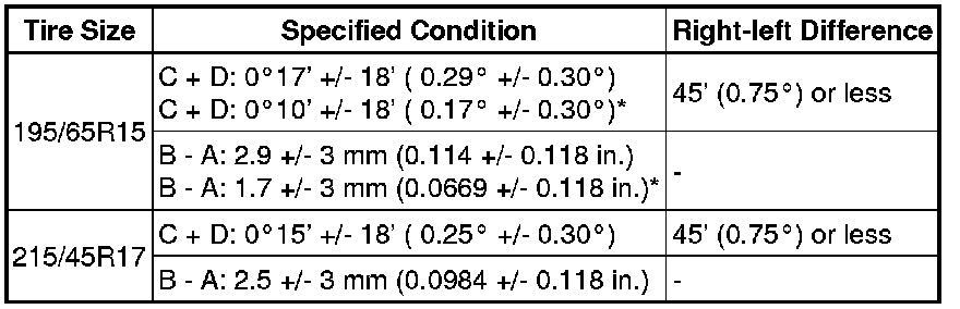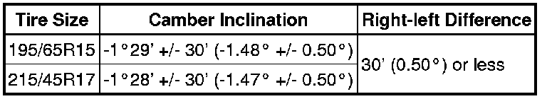 Camber is not adjustable. If the measurement is not within the specified range, inspect the suspension parts for damage and/or wear, and replace them if necessary.