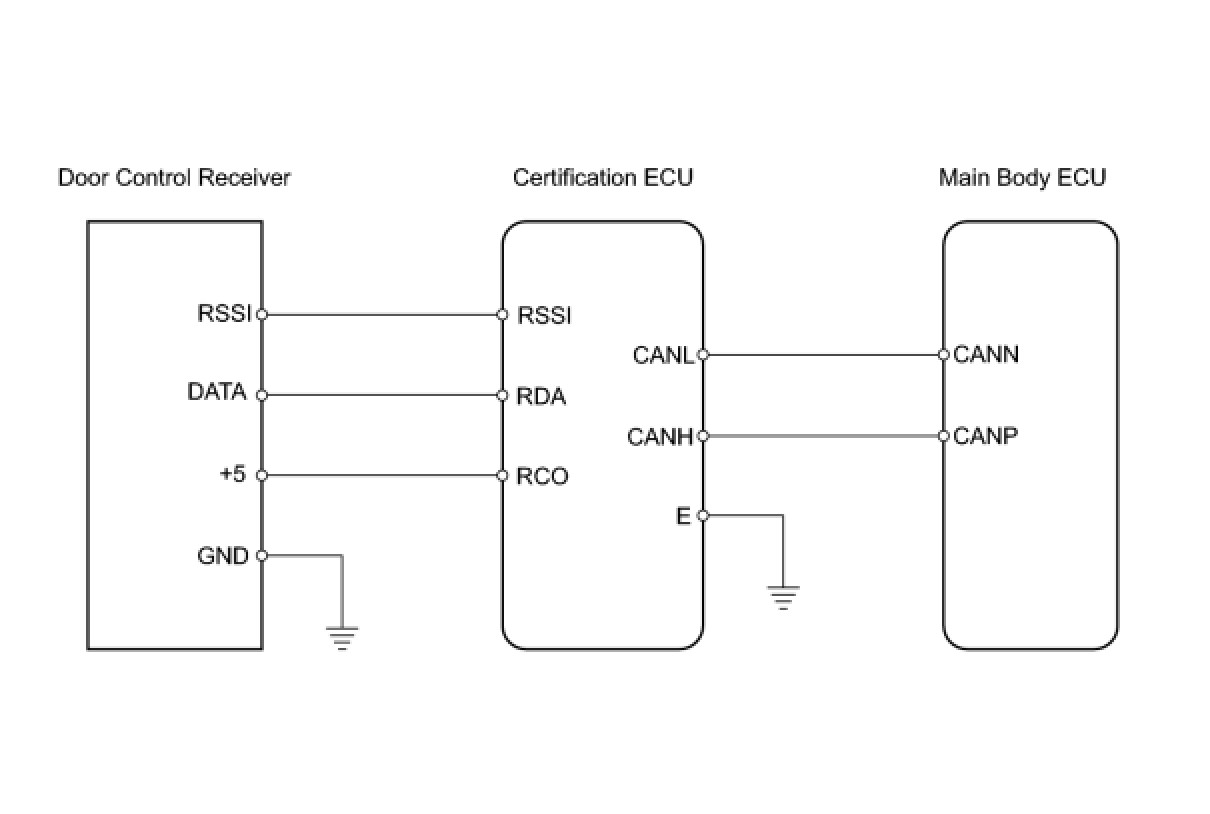 The door control receiver receives signals from the transmitter and sends these signals to the main body ECU via the certification ECU using the serial line. The main body ECU then controls all doors by sending lock / unlock signals to each door, and sends hazard flasher relay signals to the FLSH relay.