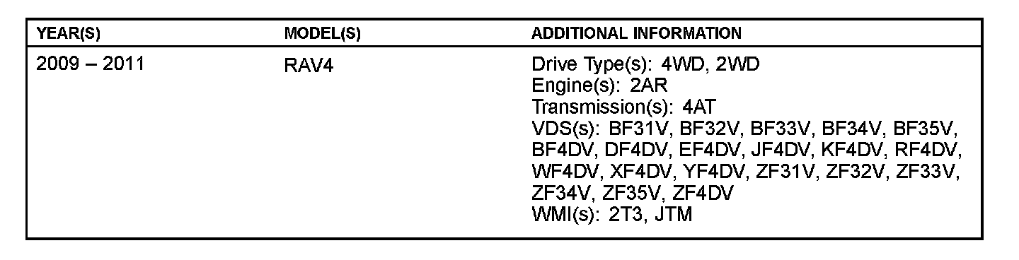 Some 2009 - 2011 model year RAV4 vehicles equipped with the 2AR-FE engine and 4 speed automatic transaxle (2WD & 4WD) may exhibit a rattle noise from the transaxle assembly between 25 - 35 MPH. The Engine Control Module/ECM (SAE term: Powertrain Control Module/PCM) logic has been revised to address this condition.