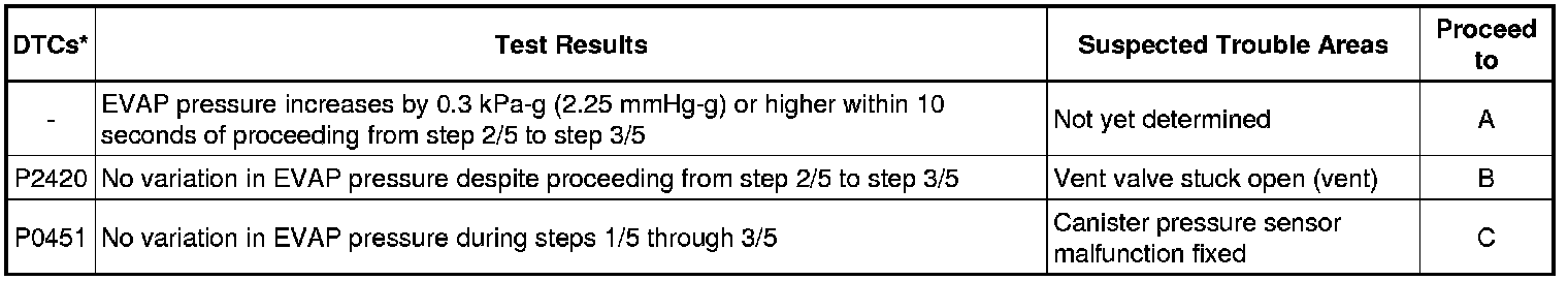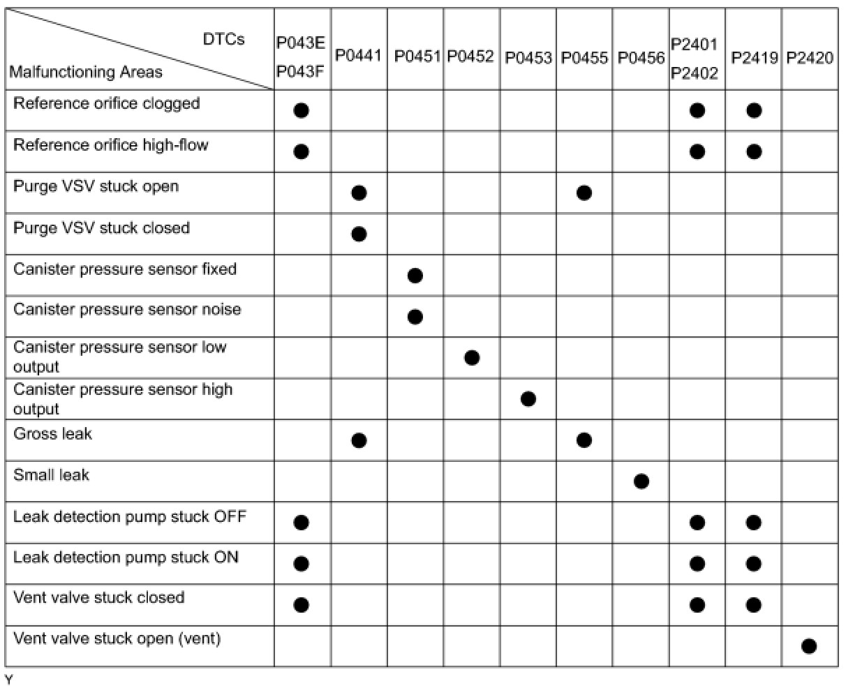 If any EVAP system DTCs are output, the malfunctioning area can be determined using the table below.