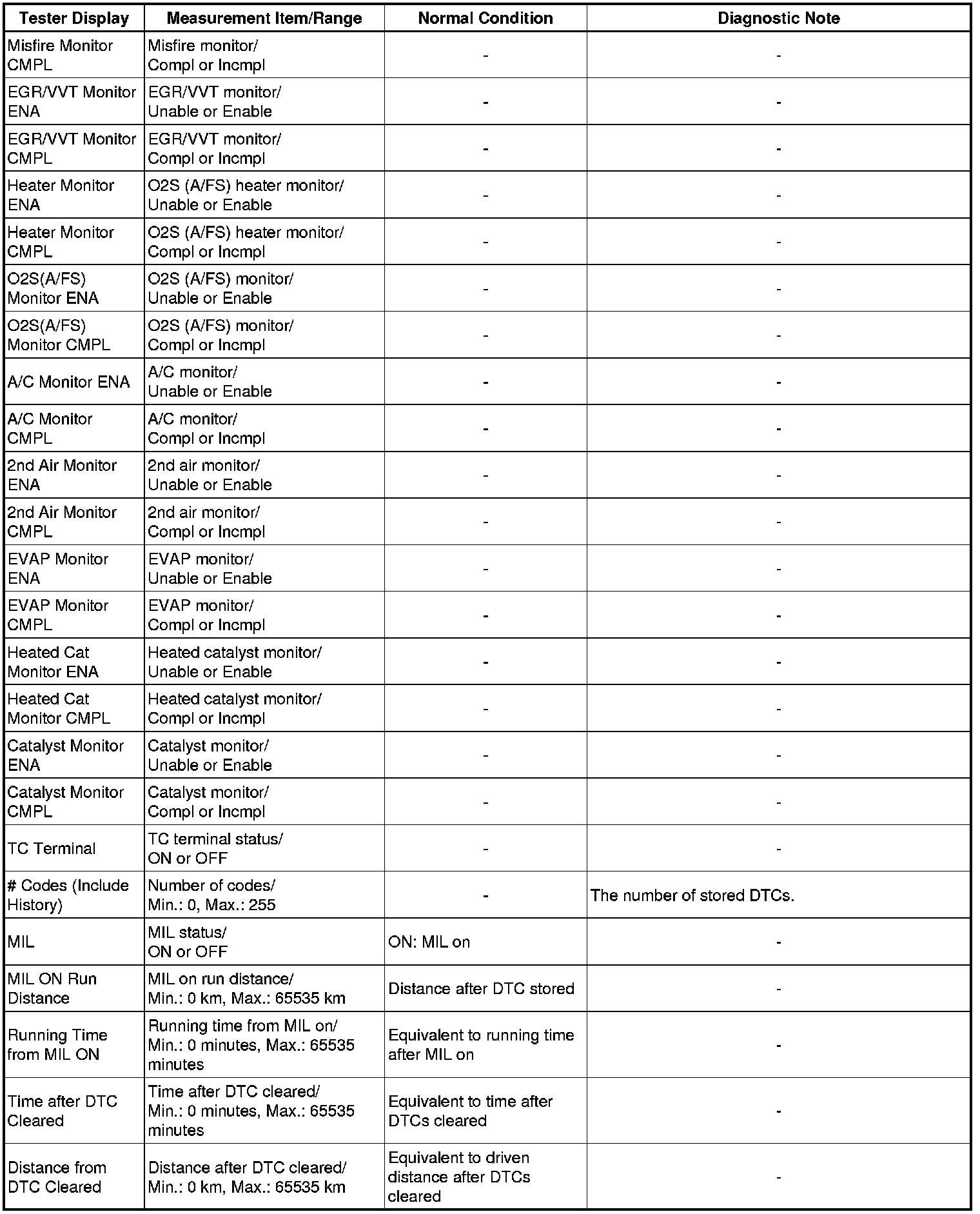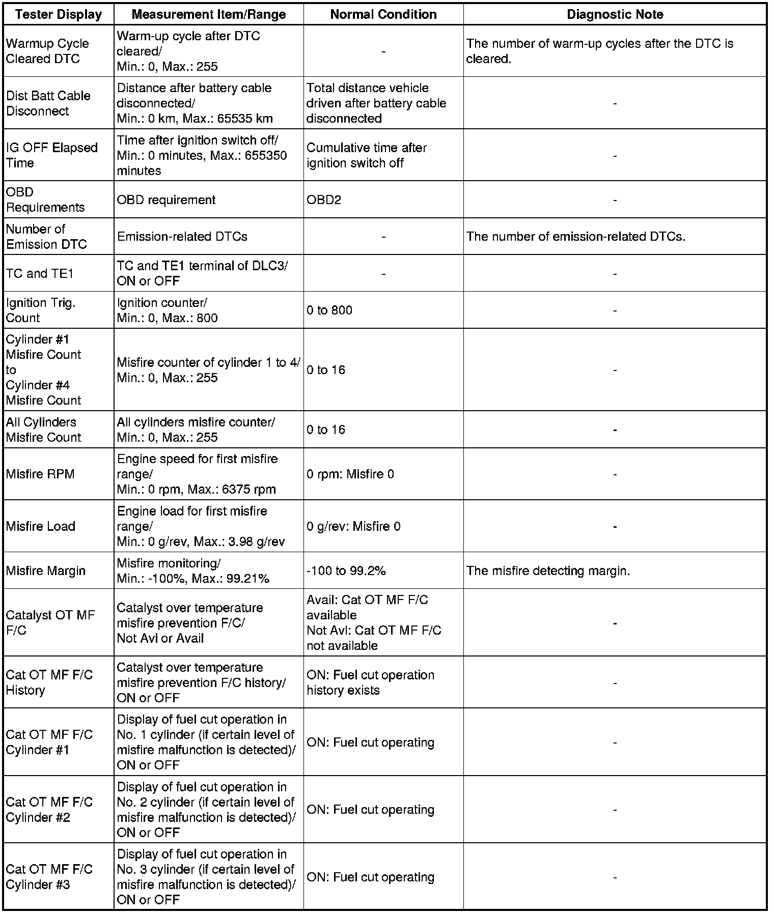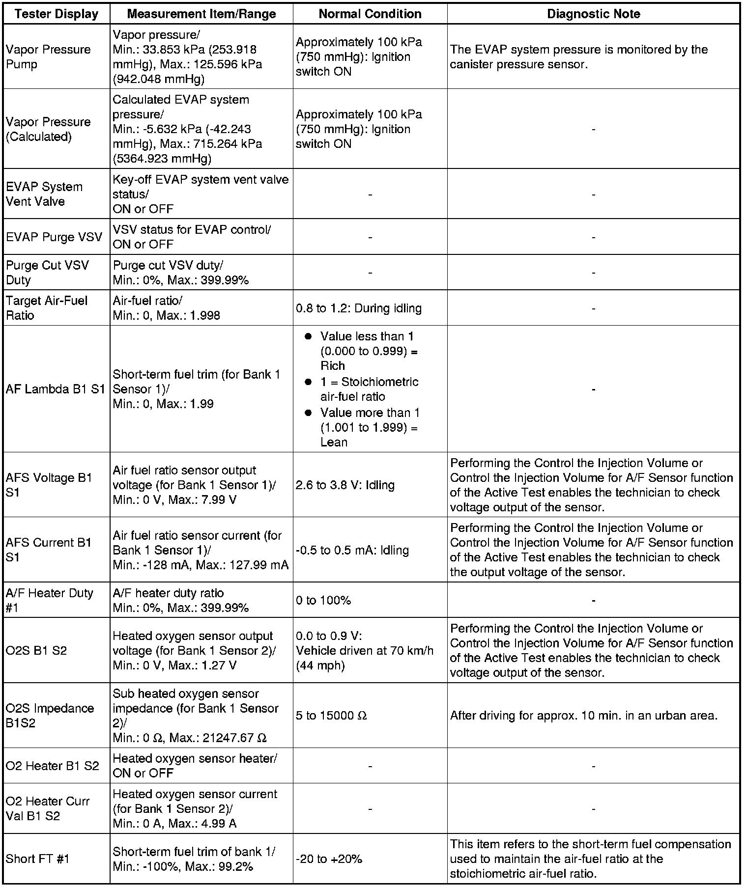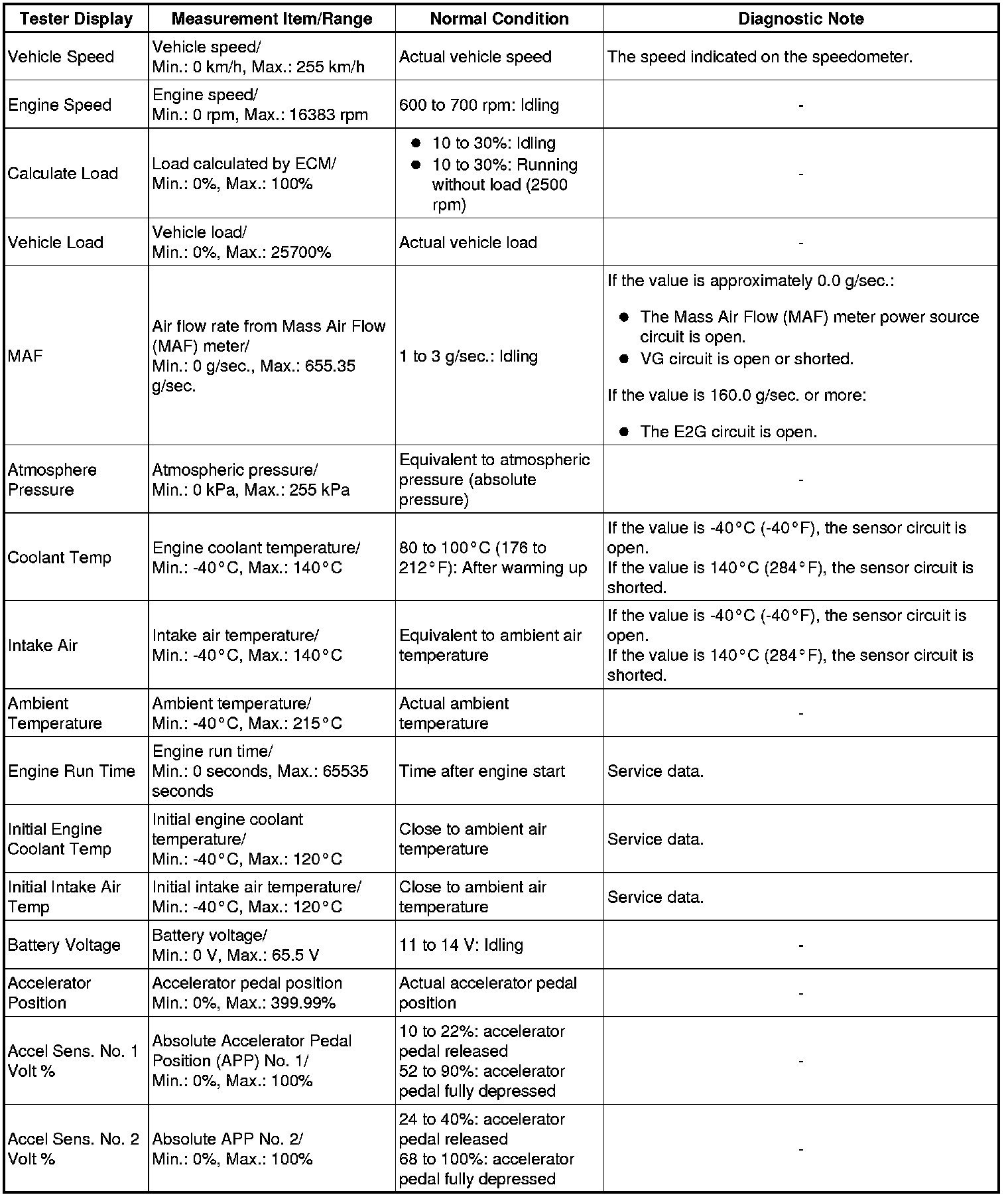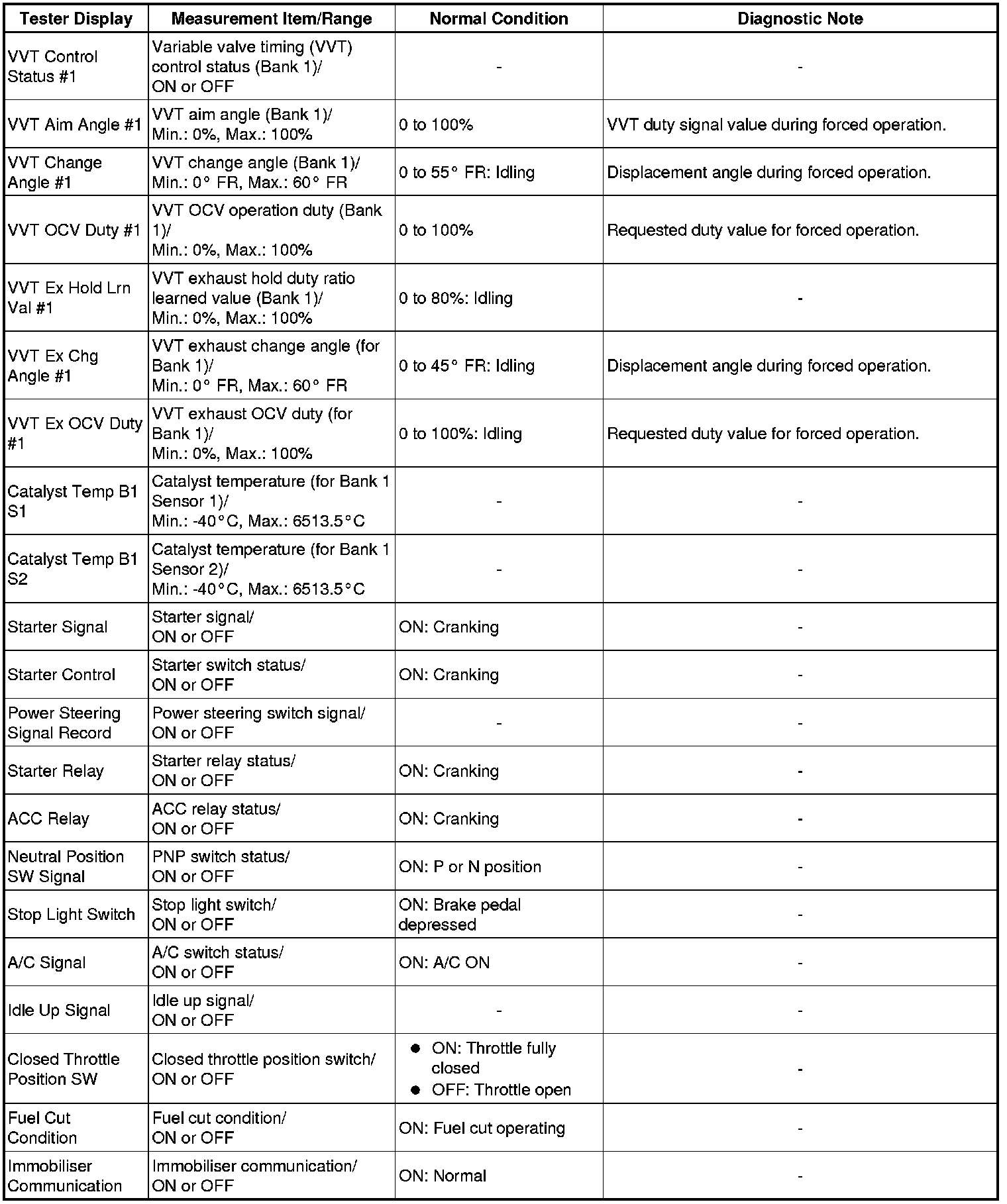 Using the Techstream to read the Data List allows the values or states of switches, sensors, actuators and other items to be read without removing any parts. This non-intrusive inspection can be very useful because intermittent conditions or signals may be discovered before parts or wiring is disturbed. Reading the Data List information early in troubleshooting is one way to save diagnostic time.