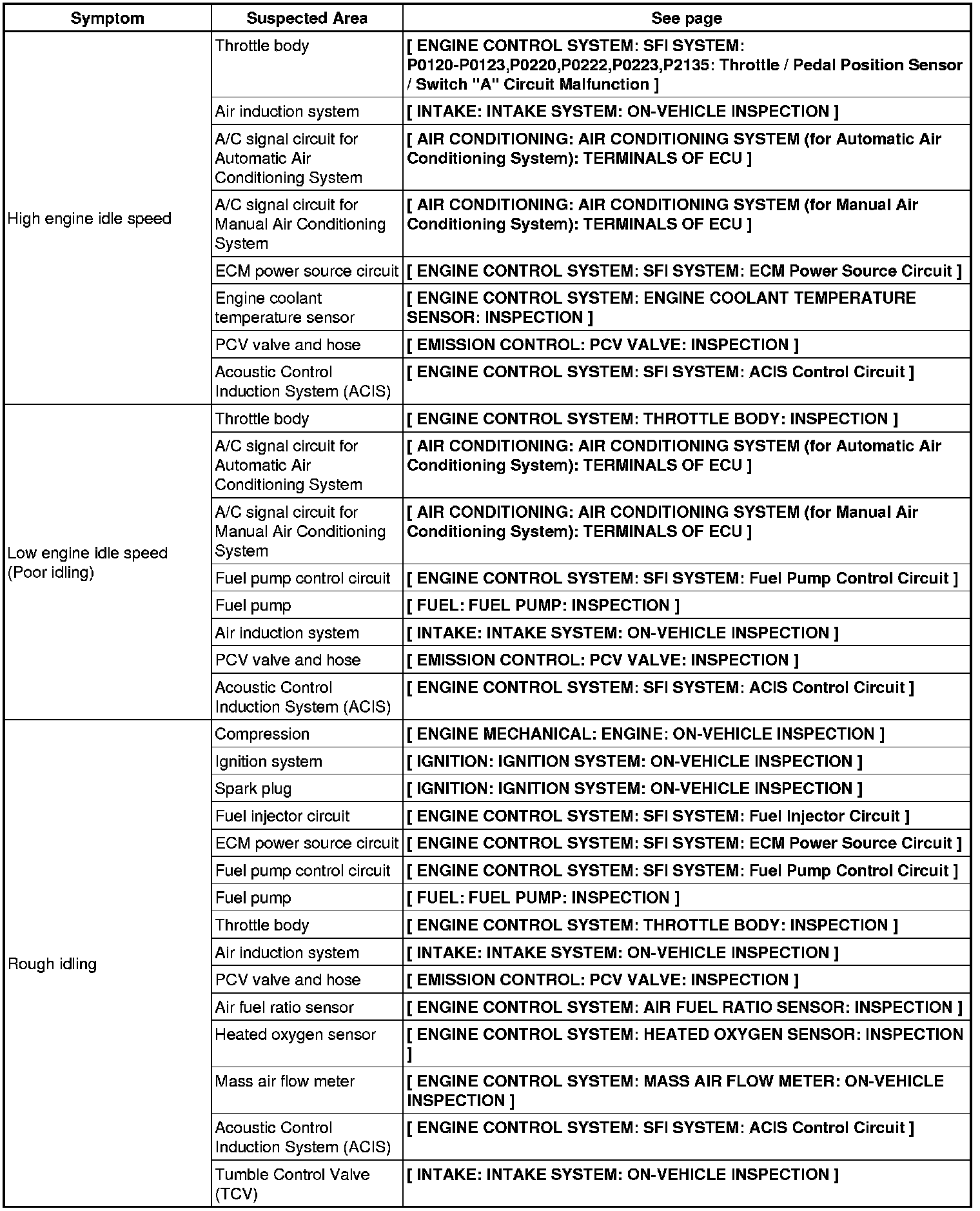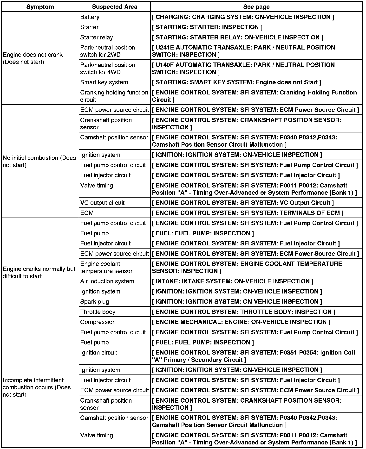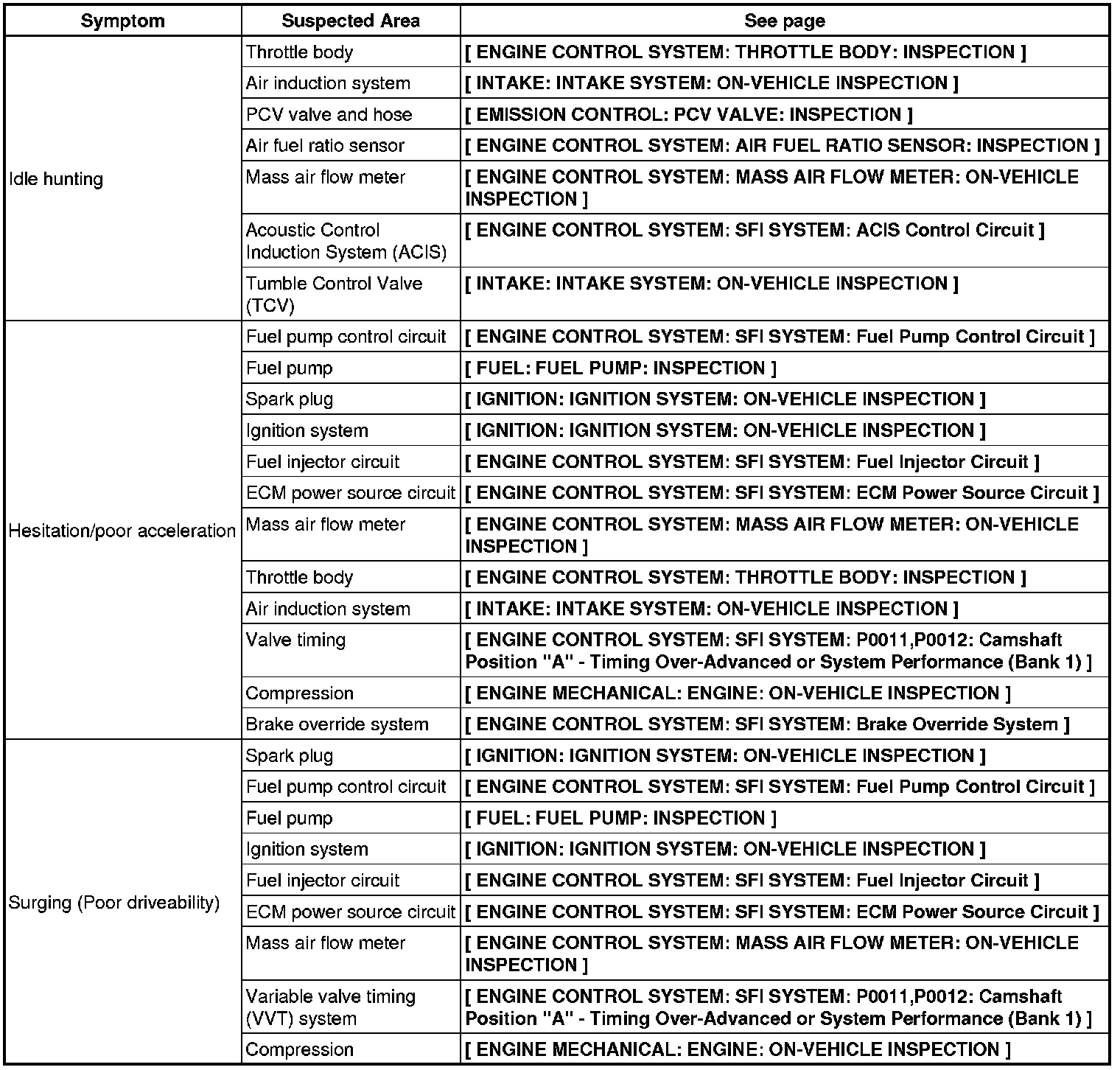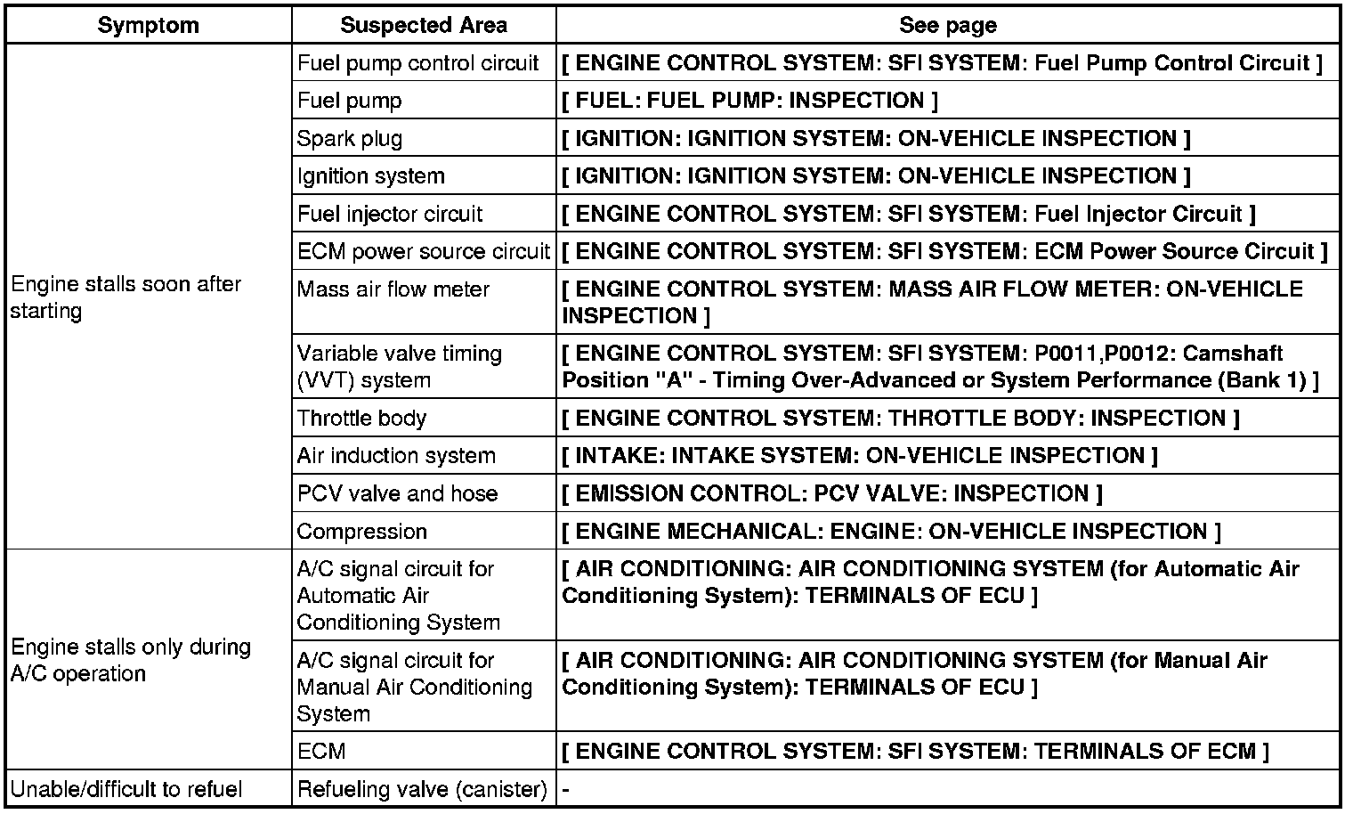 2AR-FE ENGINE CONTROL SYSTEM: SFI SYSTEM: PROBLEM SYMPTOMS TABLE