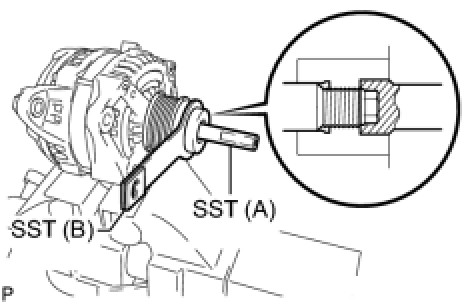 (c) Use a wrench to hold SST (A), and turn SST (B) counterclockwise to loosen the generator pulley.