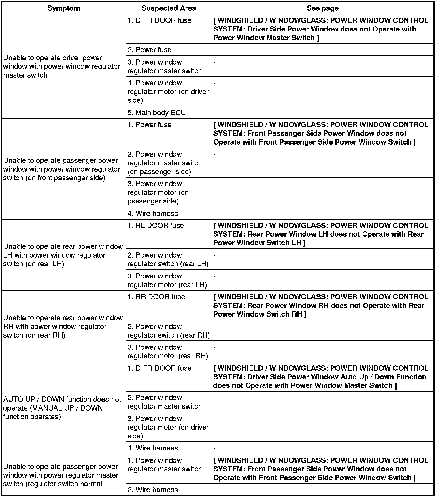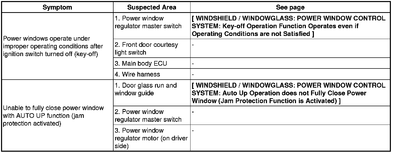 / WINDOWGLASS: POWER WINDOW CONTROL SYSTEM: PROBLEM SYMPTOMS TABLE