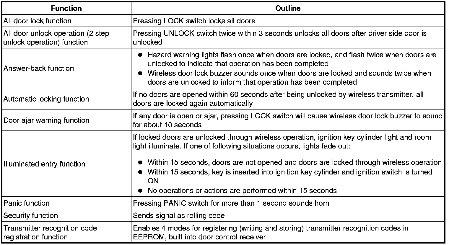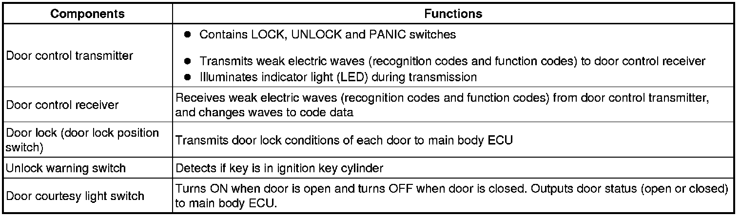 The door control receiver performs the code identification procedure and the main body ECU operates the door lock control. A serial data link is provided for communication between the receiver and main body ECU.