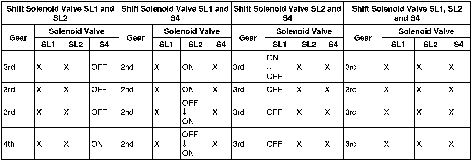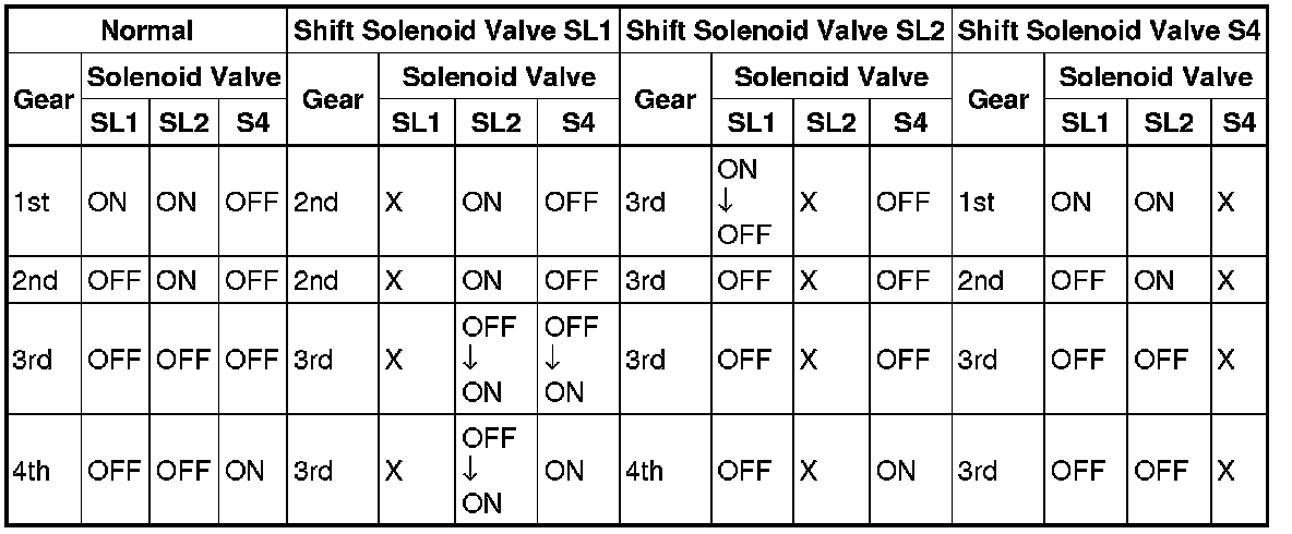 If any of the shift solenoid valve circuits develops an open or short, the ECM turns the other shift solenoid "ON" and "OFF" in order to shift into the gear positions shown in the table below.