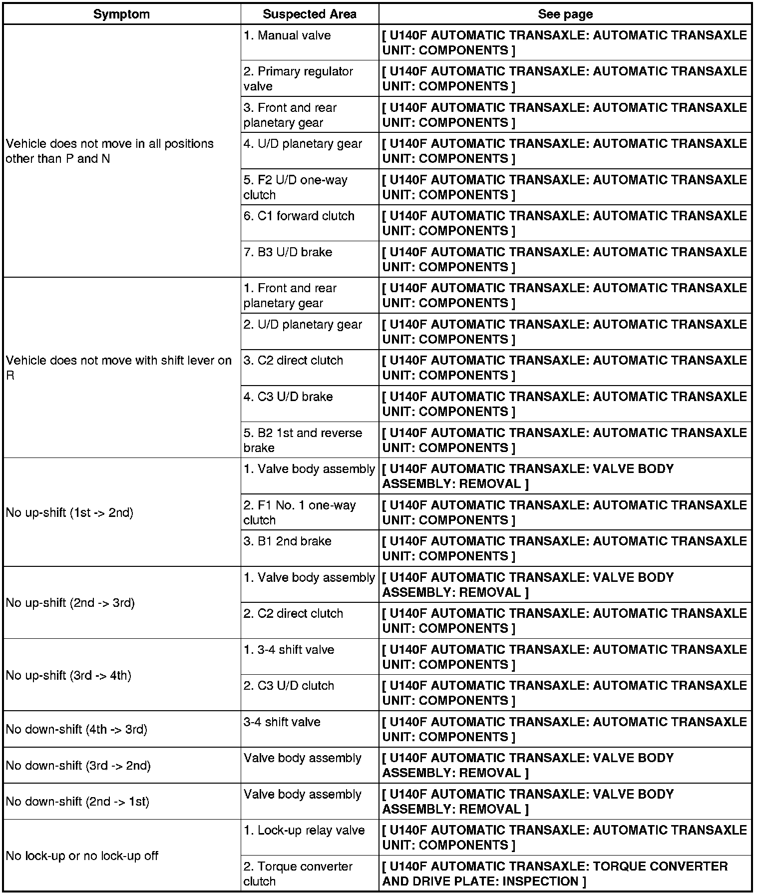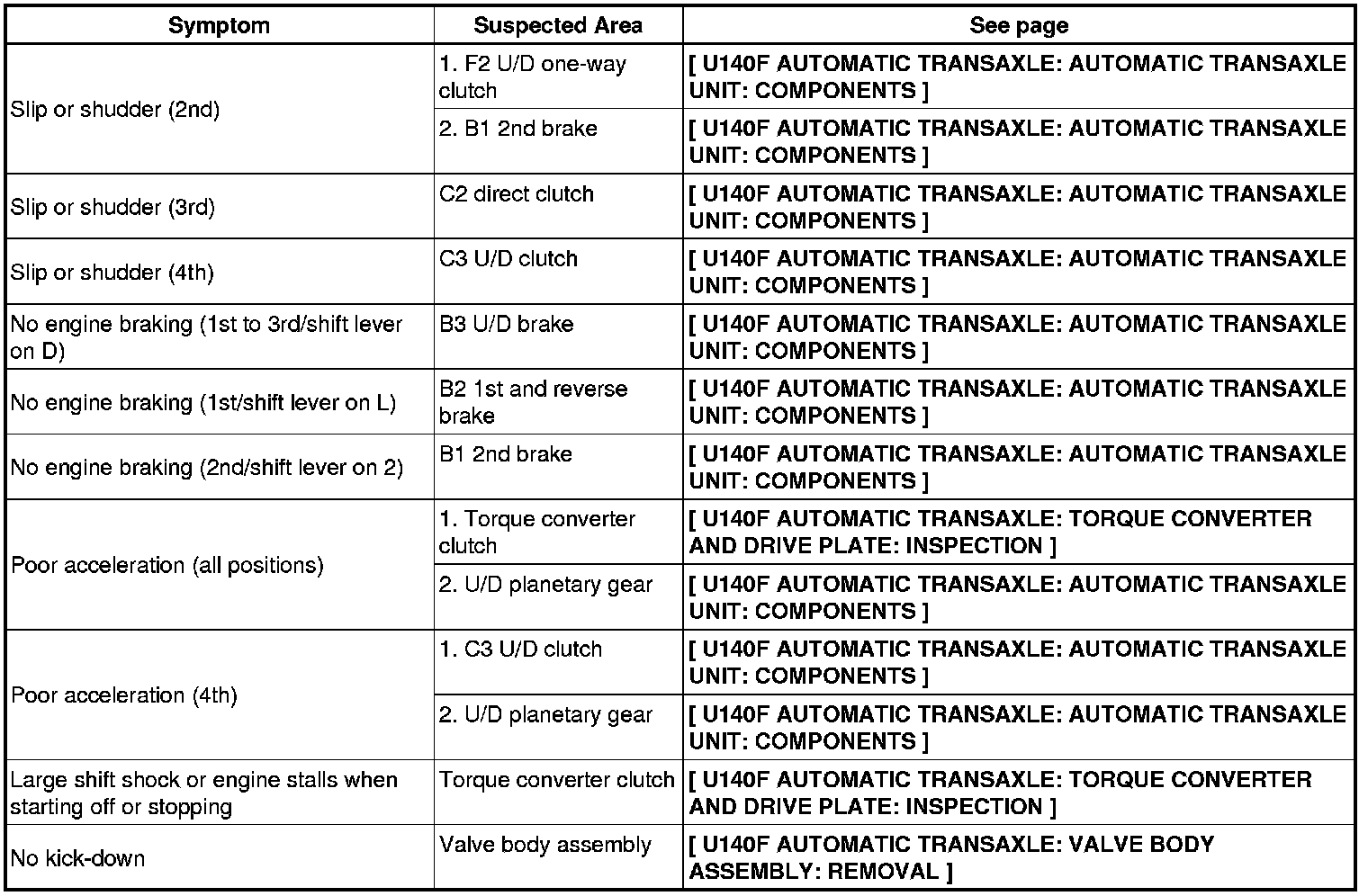 U140F AUTOMATIC TRANSAXLE: AUTOMATIC TRANSAXLE SYSTEM: PROBLEM SYMPTOMS TABLE
