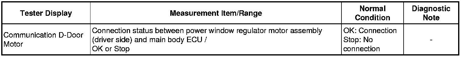 * The power window control system prohibits the AUTO UP / DOWN function when the jam protection function malfunctions. Therefore, troubleshoot the power window control system after confirming that no diagnostic codes are displayed.