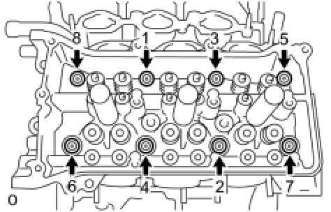 Using a 10 mm bi-hexagon wrench, install and uniformly tighten the 8 cylinder head bolts with the plate washers in several steps, in the sequence shown in the illustration.