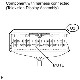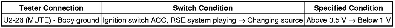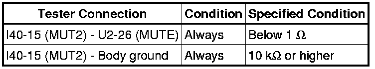 The MUTE signal is sent to reduce noise and a popping sound generated when switching the mode etc. If there is an open in the circuit, noise can be heard from the speakers when changing the sound source. If there is a short in the circuit, even though the navigation receiver assembly is functioning normally, no sound or only an extremely faint sound can be heard.