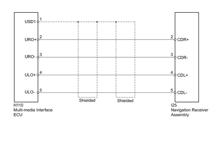 The multi-media interface ECU sends sound signals to the navigation receiver assembly through this circuit. If there is an open or short in the circuit, sound cannot be heard from the speakers even if there is no malfunction in the stereo component amplifier assembly, navigation receiver assembly or speakers.