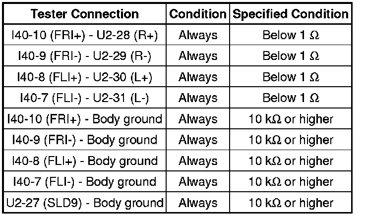 The stereo component tuner assembly sends sound signals to the television display assembly through this circuit. If there is an open or short in the circuit, sound cannot be heard from the speakers even if there is no malfunction in the stereo component amplifier assembly, navigation receiver assembly or speakers.