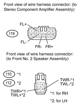 (a) Disconnect the I10*1 and/or I12*2 front No. 2 speaker assembly connector.