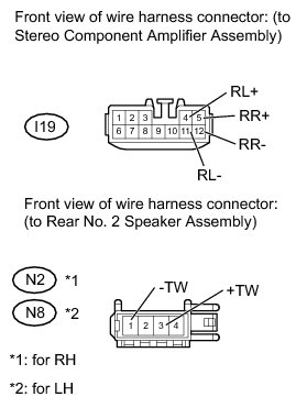 (a) Disconnect the N2*1 and/or N8*2 rear No. 2 speaker assembly connector.