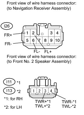 (b) Disconnect the I11*1 and/or I13*2 front No. 2 speaker assembly connector.