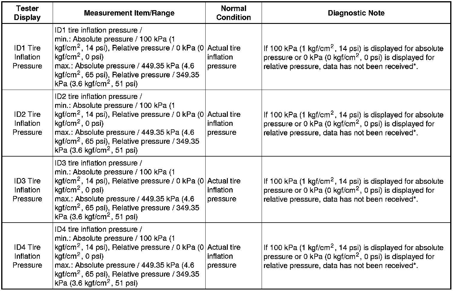 * *: It may take up to about 5 to 6 minutes to update the tire pressure data. If the values are not displayed after about 5 to 6 minutes, perform troubleshooting according to the inspection procedure for DTCs C2121/21 to C2124/24 DTC 84.