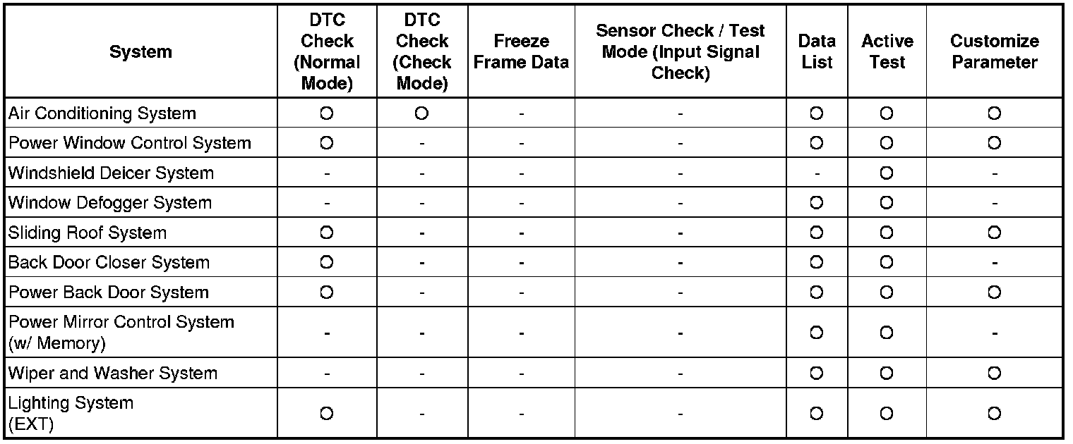 By using these functions, the problem areas can be narrowed down and troubleshooting is more effective. Diagnostic functions are incorporated in the following systems in the TOYOTA SEQUOIA.