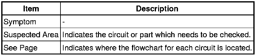 When a "Normal" code is output during a DTC check but the problem is still occurring, use the Problem Symptoms Table. The suspected areas (circuits or parts) for each problem symptom are in the table. The suspected areas are listed in order of probability. A description of each of the chart's columns is below.