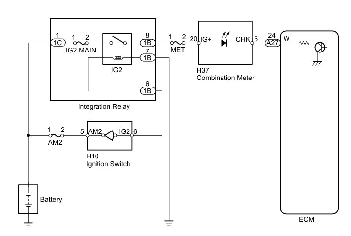 The MIL (Malfunction Indicator Lamp) is used to indicate vehicle malfunction detections by the ECM. When the ignition switch is turned to ON, power is supplied to the MIL circuit, and the ECM provides the circuit ground which illuminates the MIL.