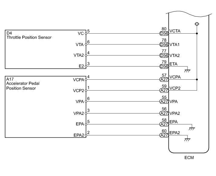 The ECM constantly generates 5 V power from the battery voltage supplied to the +B (BATT) terminal to operate the microprocessor. The ECM also provides this power to the sensors through the VC output circuit.