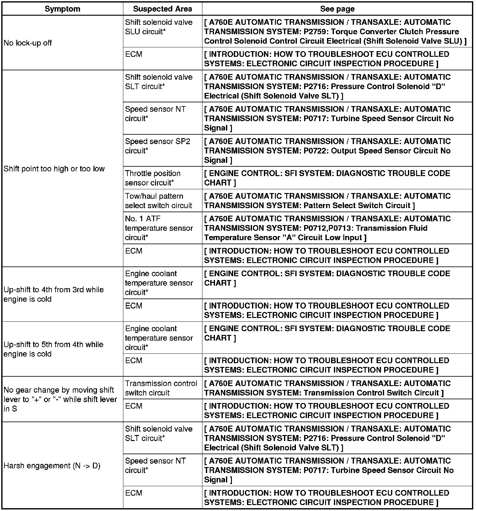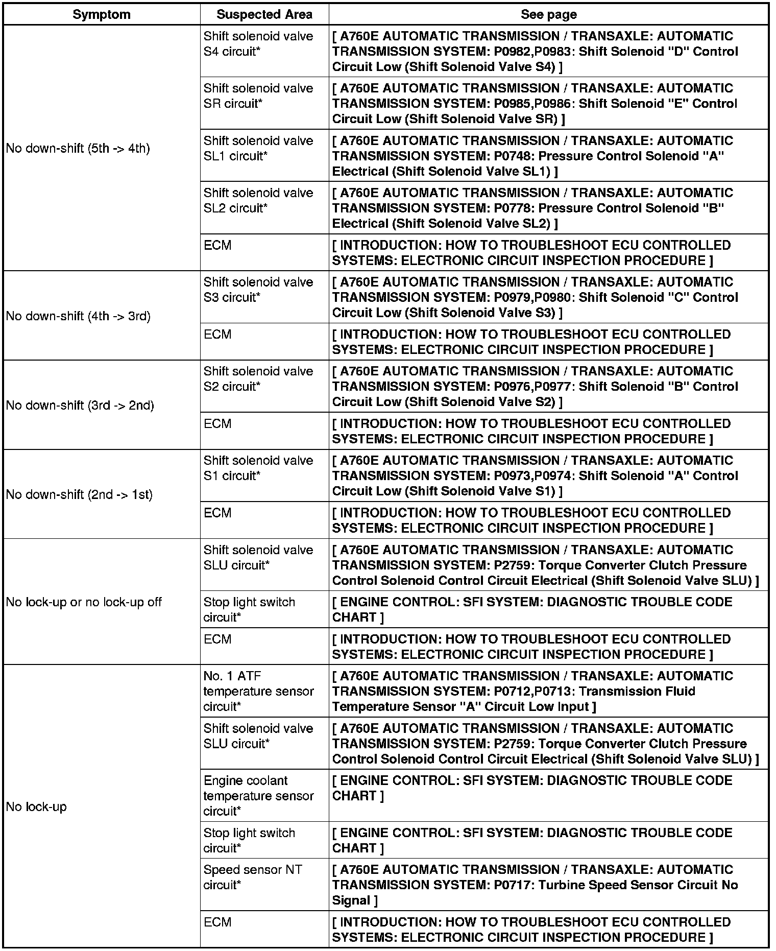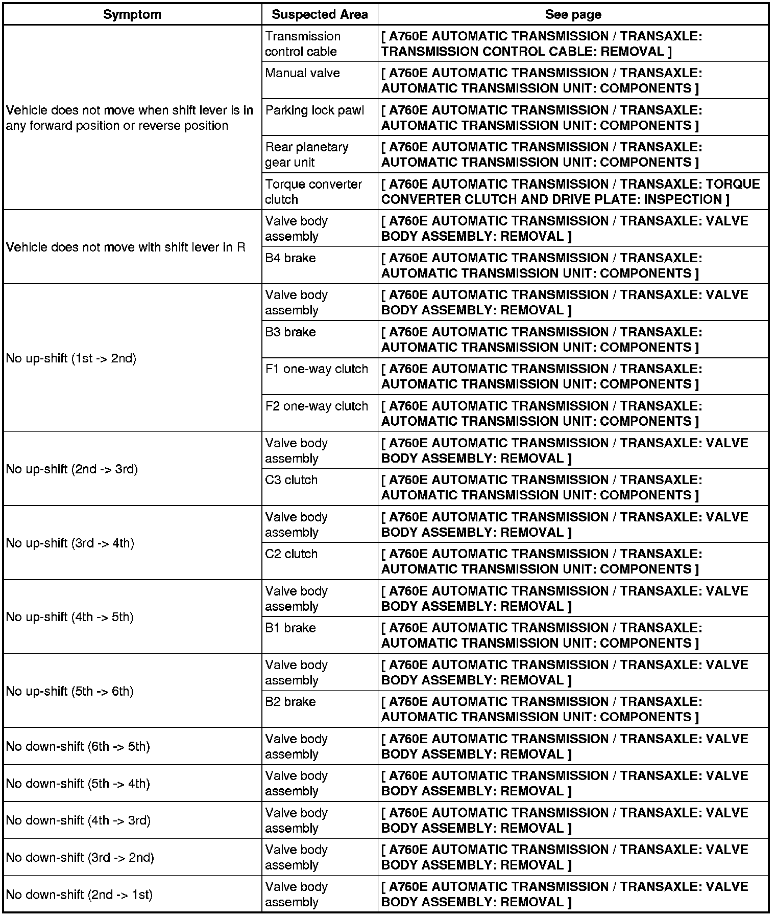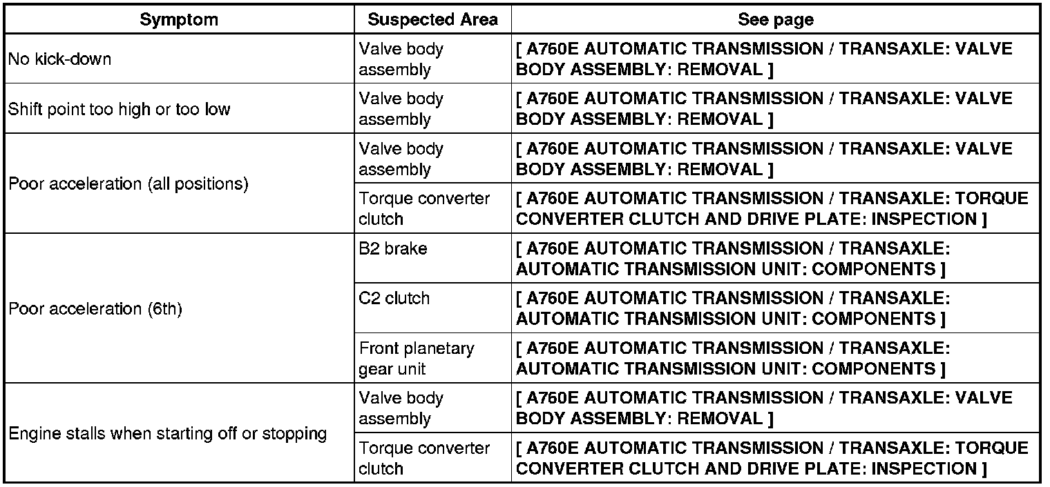 A760E AUTOMATIC TRANSMISSION / TRANSAXLE: AUTOMATIC TRANSMISSION SYSTEM: PROBLEM SYMPTOMS TABLE