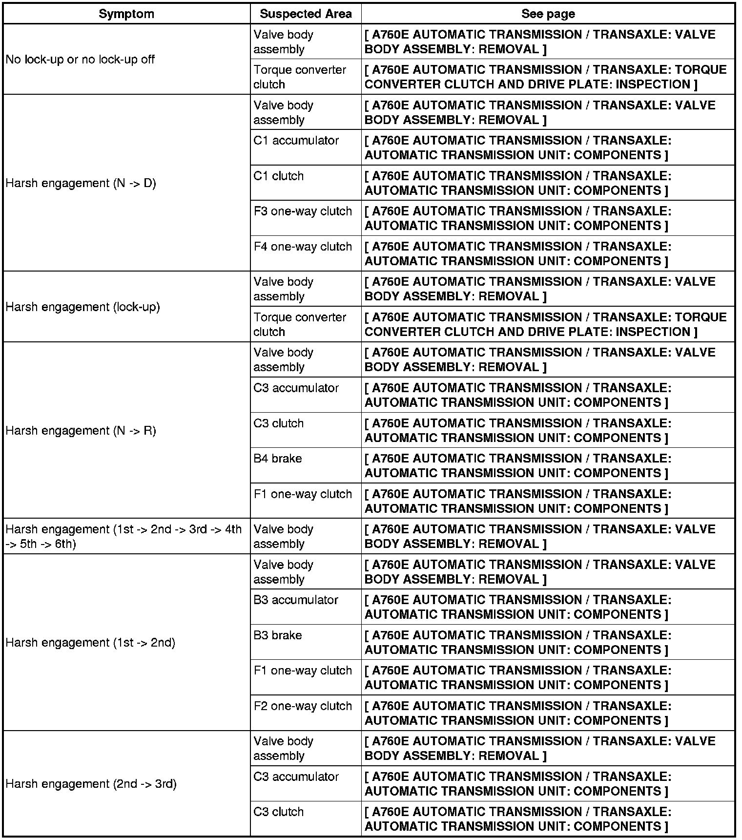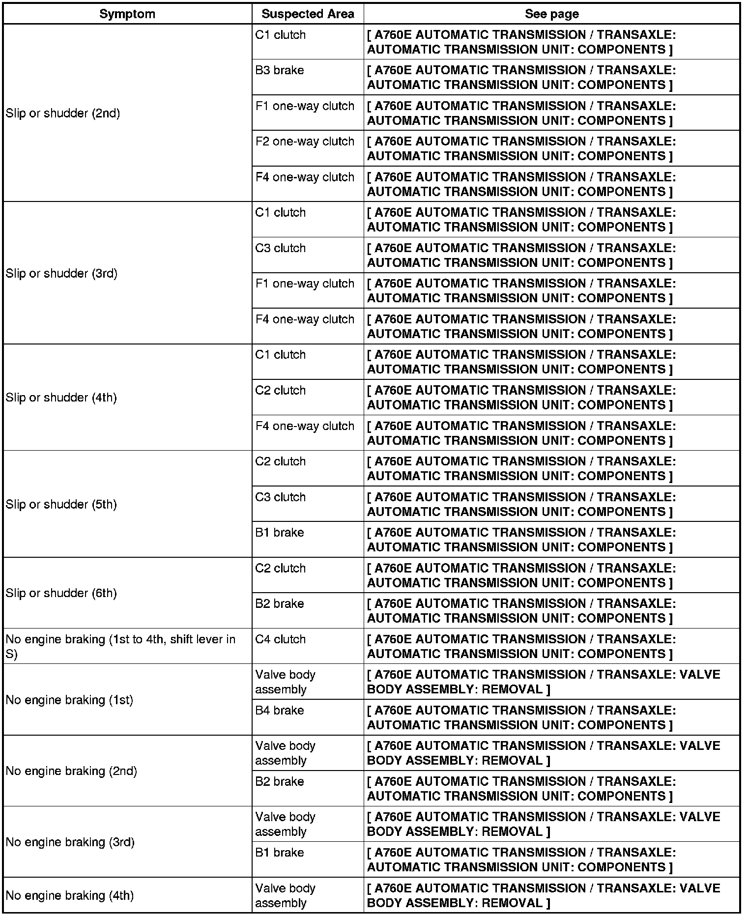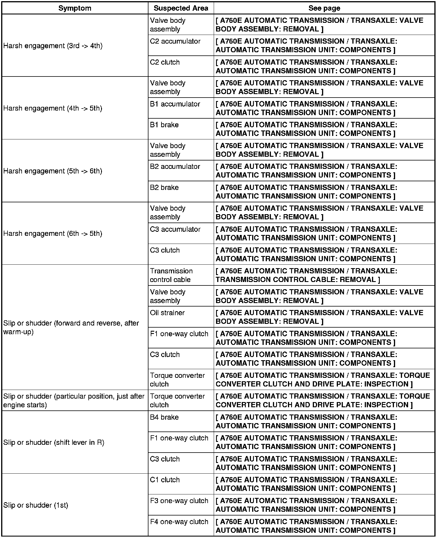 A760E AUTOMATIC TRANSMISSION / TRANSAXLE: AUTOMATIC TRANSMISSION SYSTEM: PROBLEM SYMPTOMS TABLE