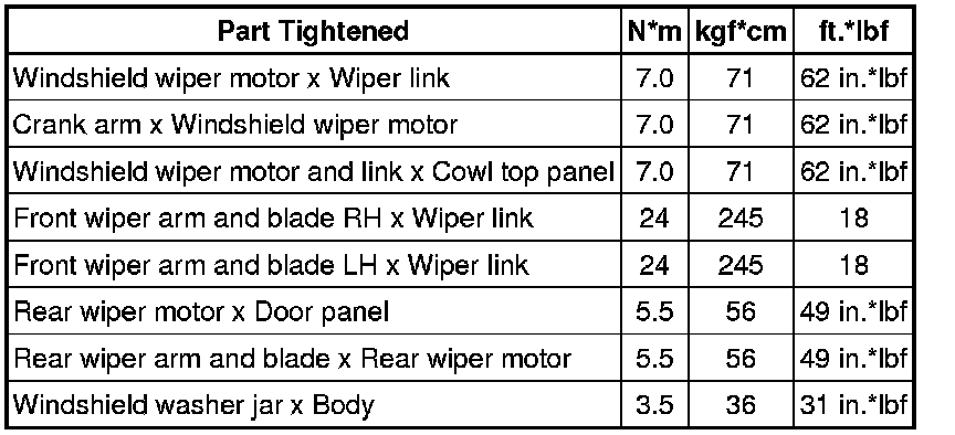 SPECIFICATIONS: WIPER / WASHER: TORQUE SPECIFICATIONS