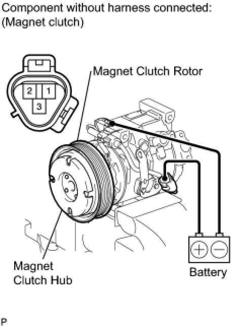 (1) Confirm that the magnet clutch hub and magnet clutch rotor lock when the battery positive lead is connected to terminal 3 of the magnet clutch, and the negative lead is connected to the ground wire.