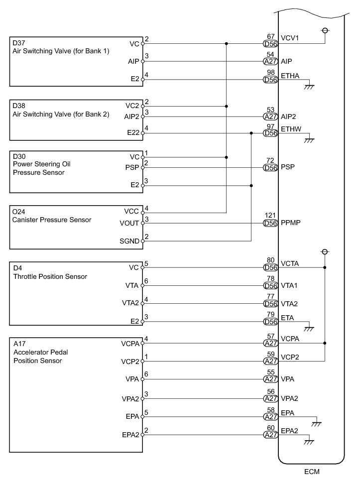 The ECM constantly generates 5 V power from the battery voltages supplied to the +B (BATT) terminal to operate the microprocessor. The ECM also provides this power to the sensors through the VC output circuit.