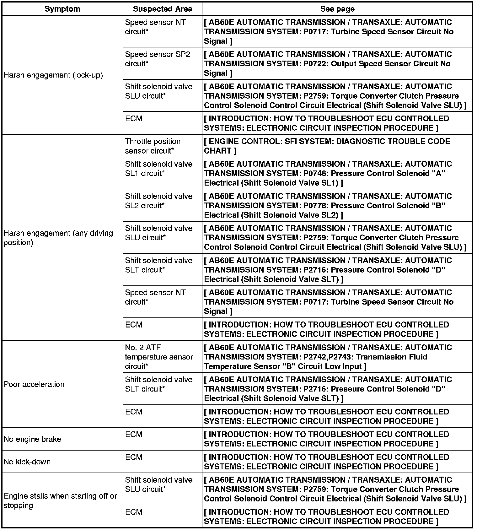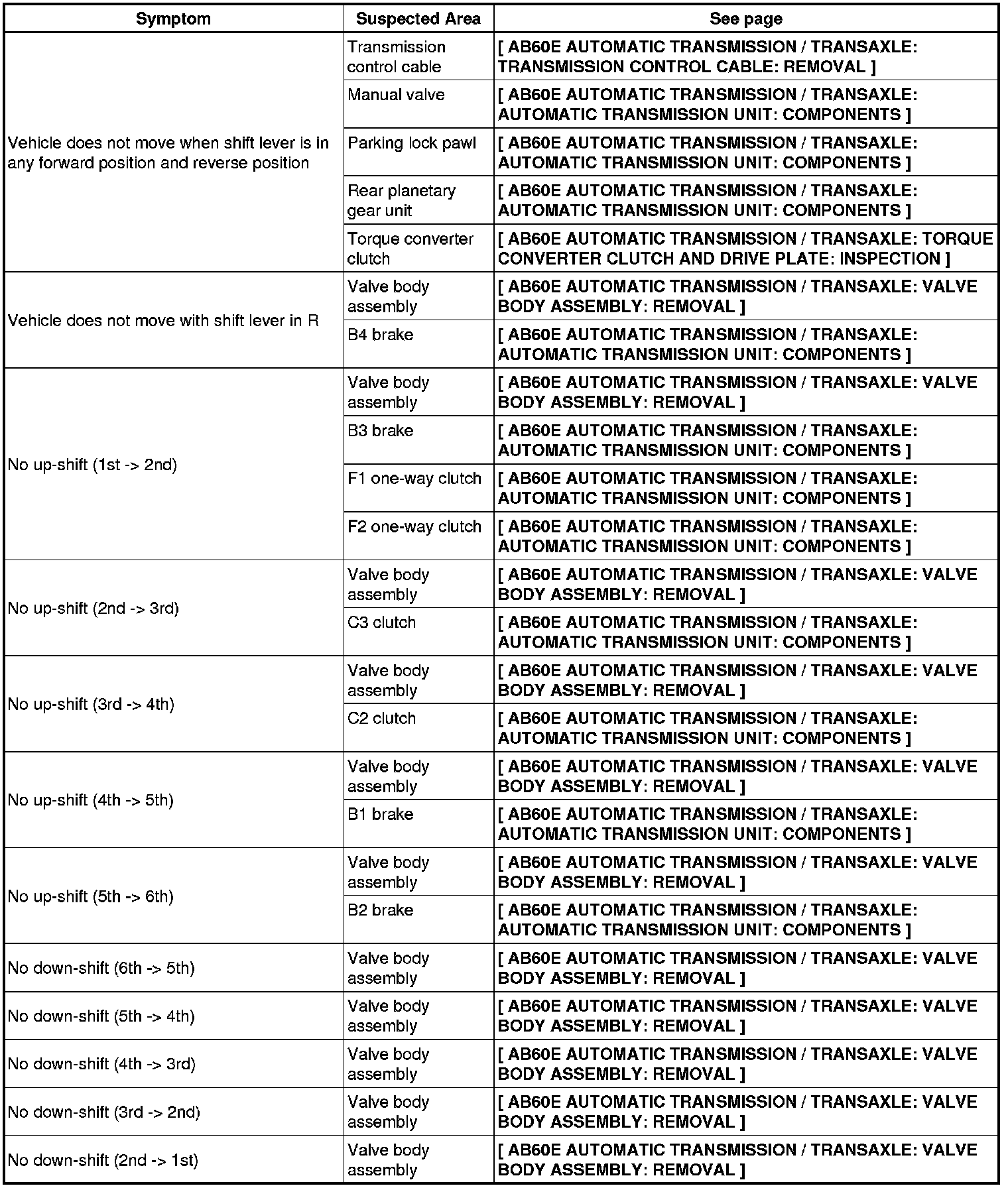 AB60E AUTOMATIC TRANSMISSION / TRANSAXLE: AUTOMATIC TRANSMISSION SYSTEM: PROBLEM SYMPTOMS TABLE