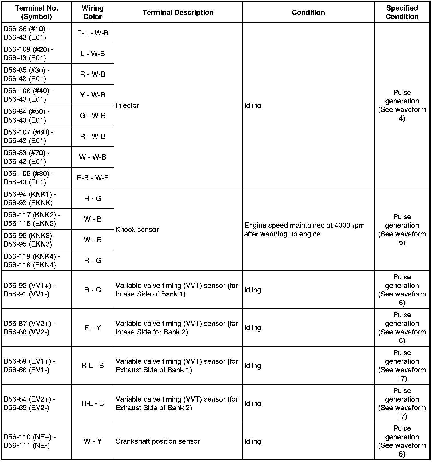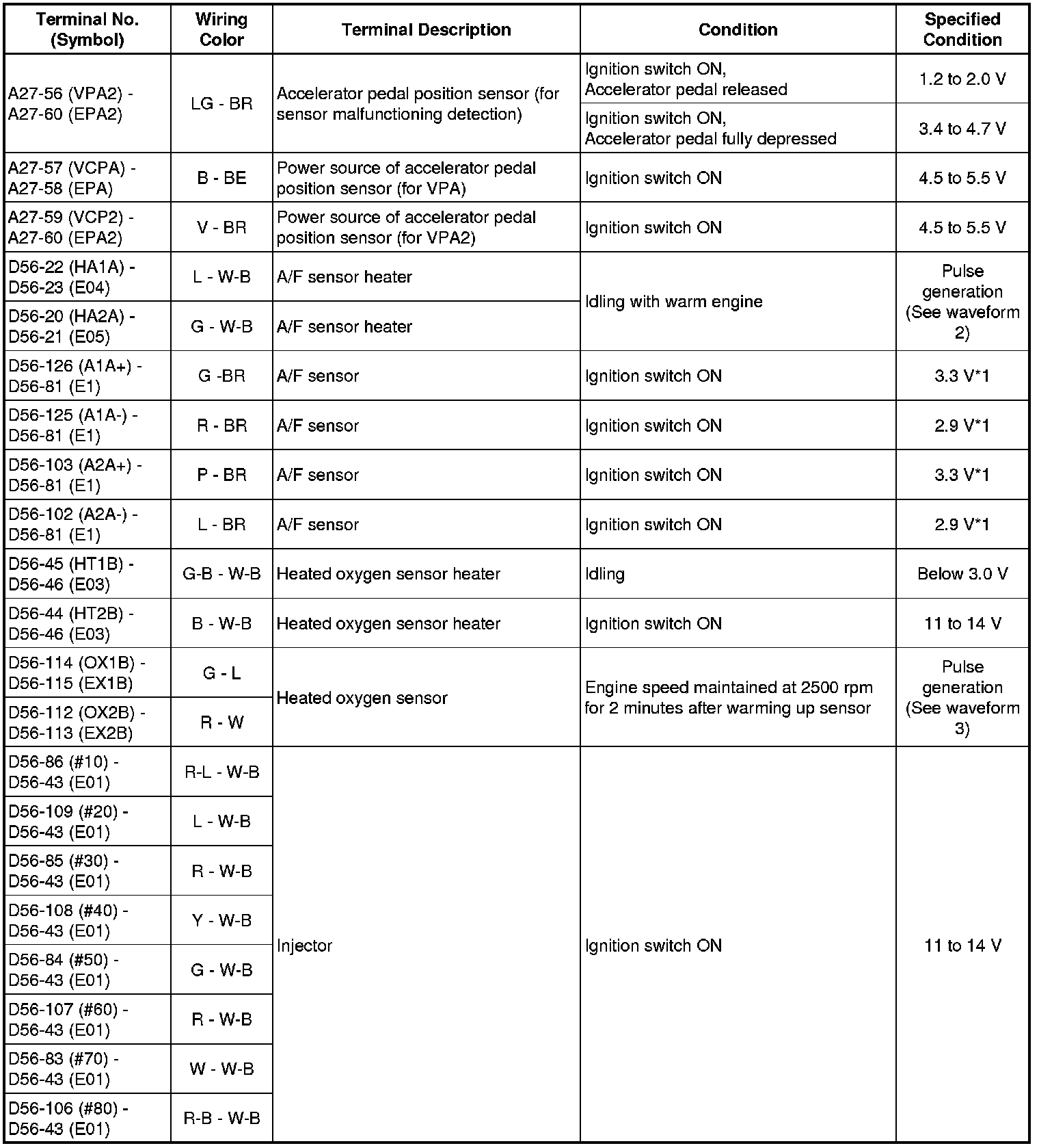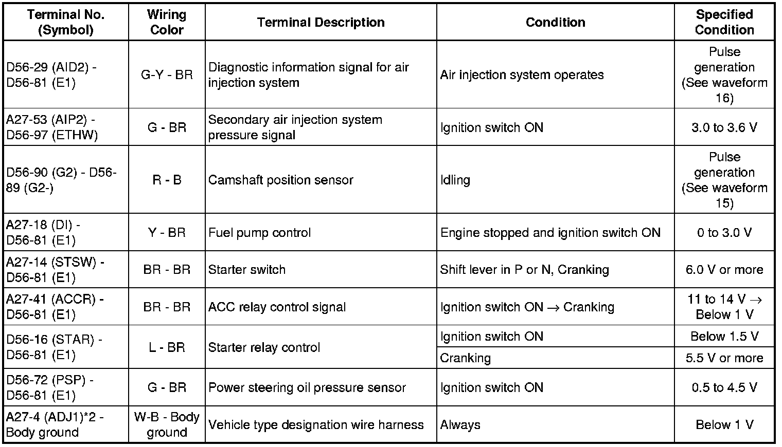 The standard normal voltage between each pair of ECM terminals is shown in the table below. The appropriate conditions for checking each pair of terminals are also indicated. The result of checks should be compared with the standard normal voltage for that pair of terminals, displayed in the Specified Condition column. The illustration above can be used as a reference to identify the ECM terminal locations.
