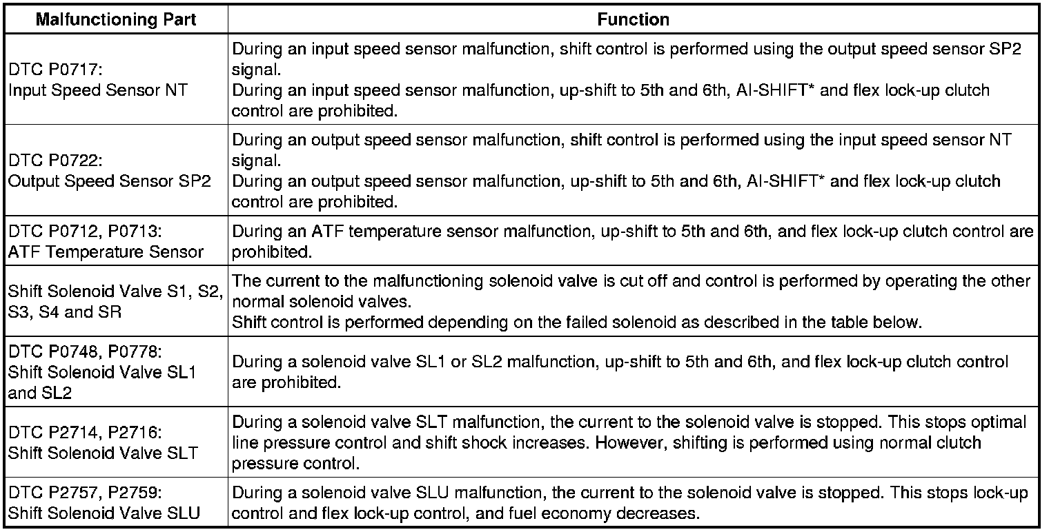 If any of the shift solenoid valve circuits has an open or short failure, the ECM turns the other shift solenoids ON and OFF in order to shift into the gear positions shown in the table below. Also, the ECM stops sending current to the open or short-circuited solenoid.