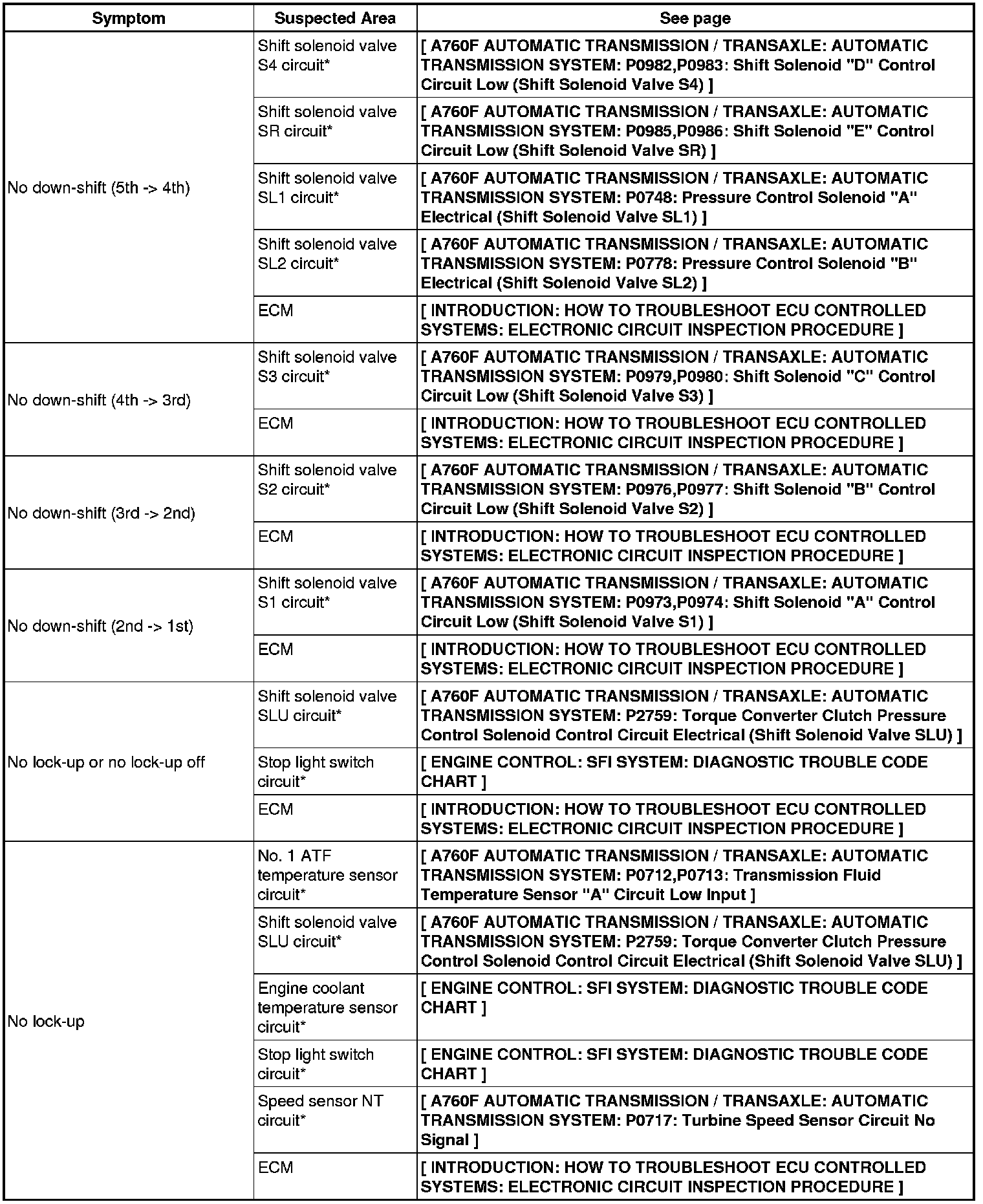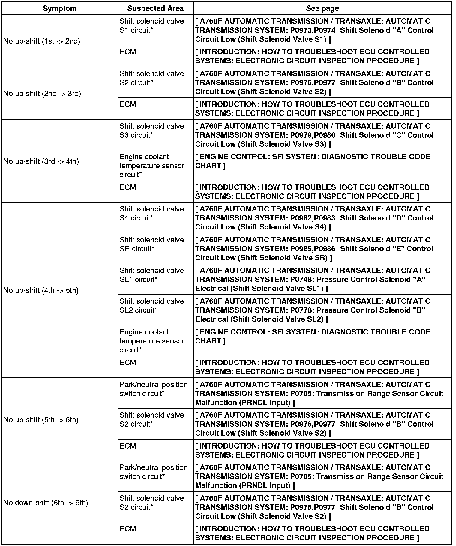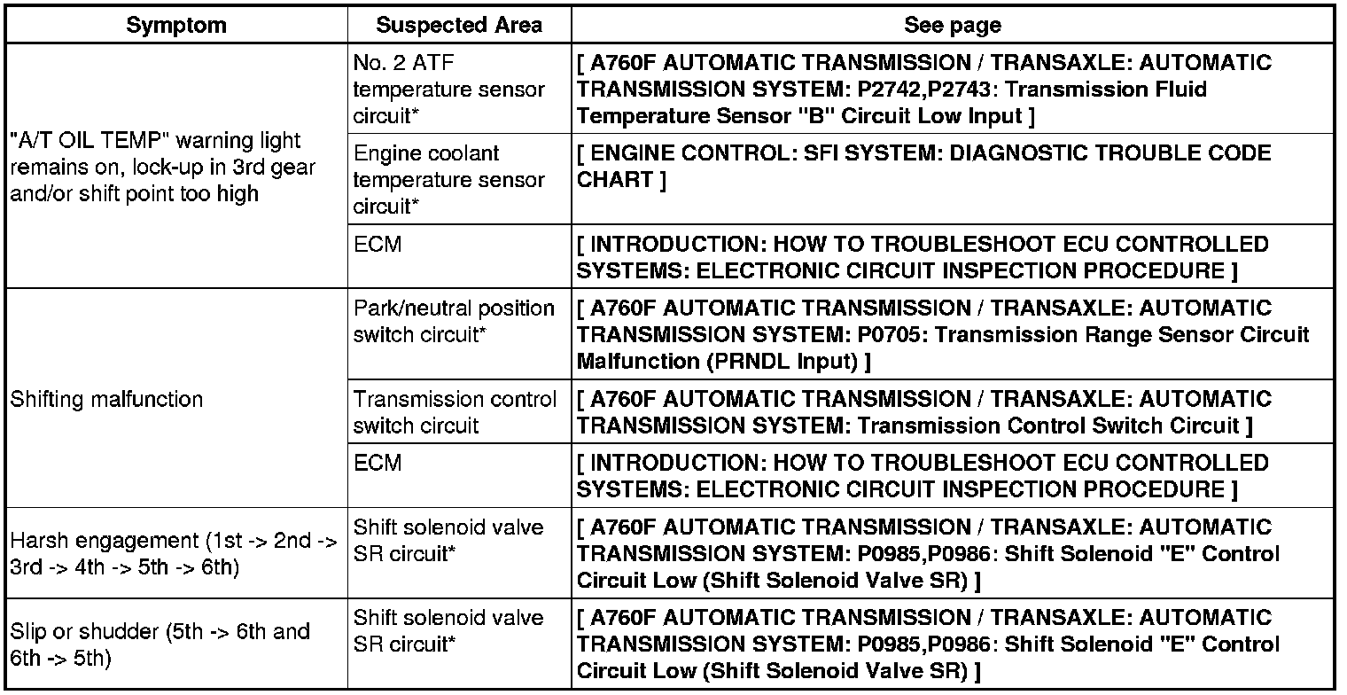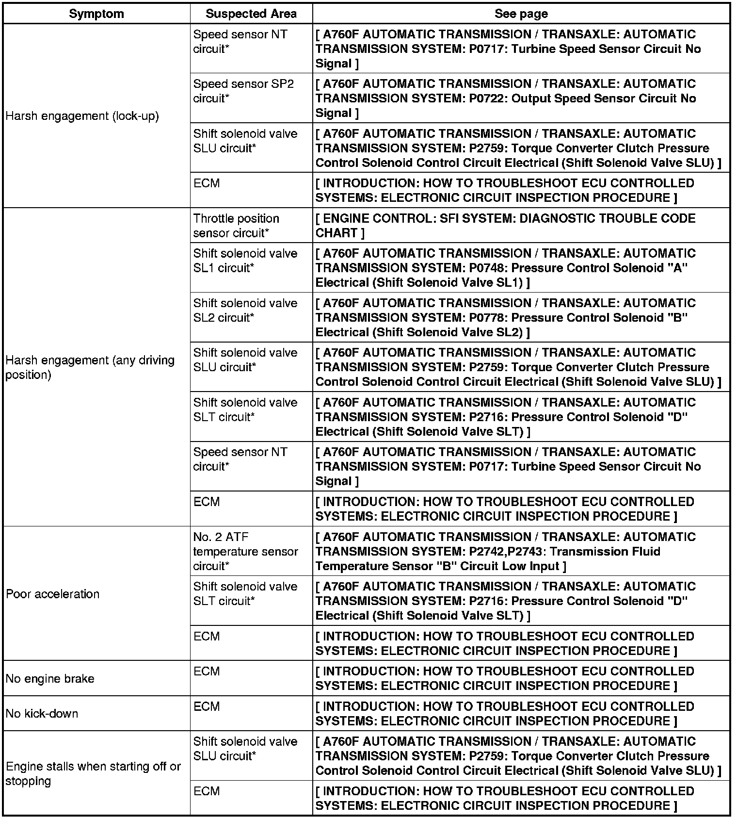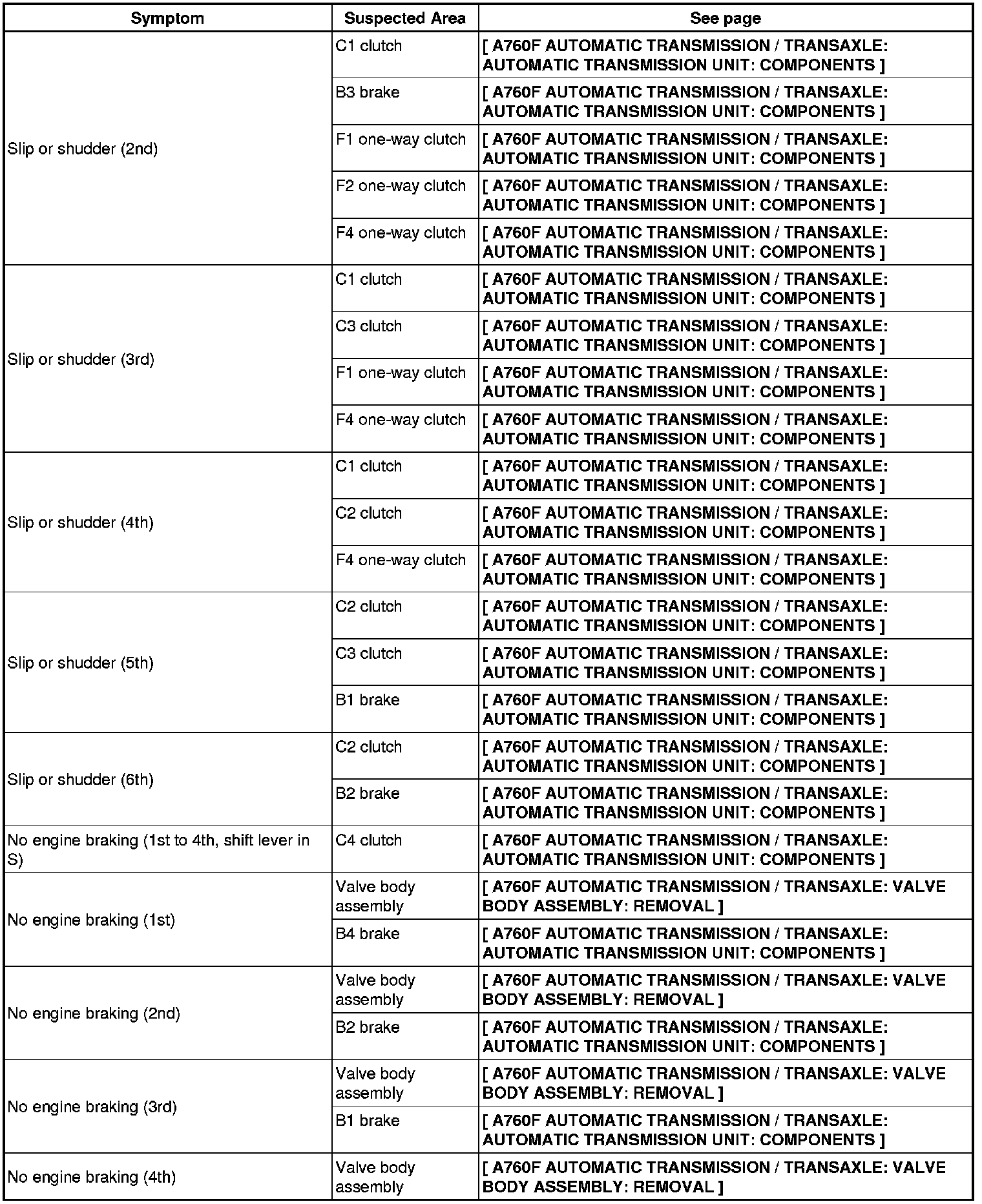 A760F AUTOMATIC TRANSMISSION / TRANSAXLE: AUTOMATIC TRANSMISSION SYSTEM: PROBLEM SYMPTOMS TABLE