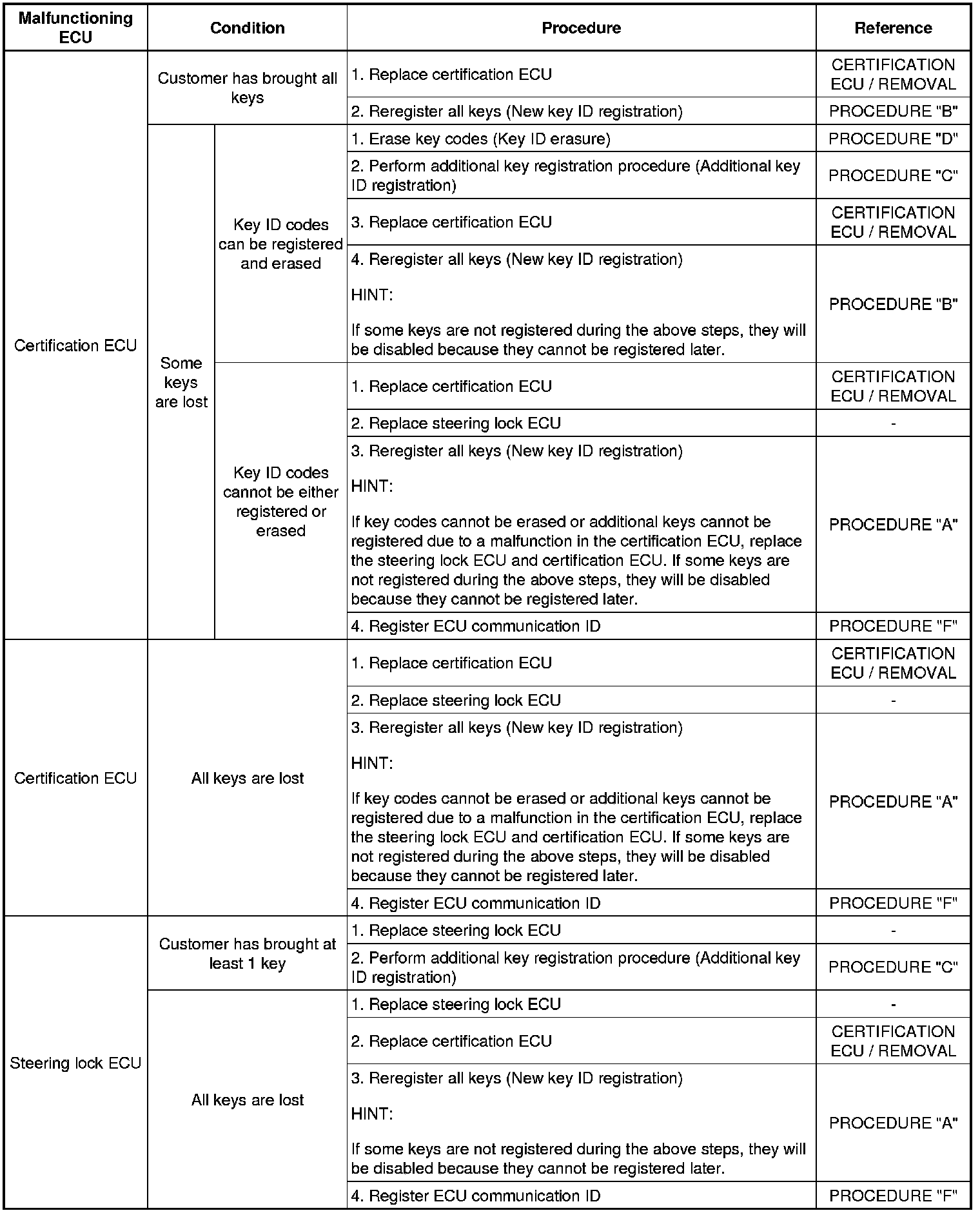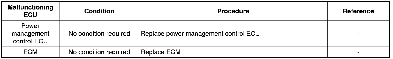 (a) The following table shows ECU replacement and key registration procedures for cases in which a malfunctioning ECU has been identified through the troubleshooting of the smart key system.