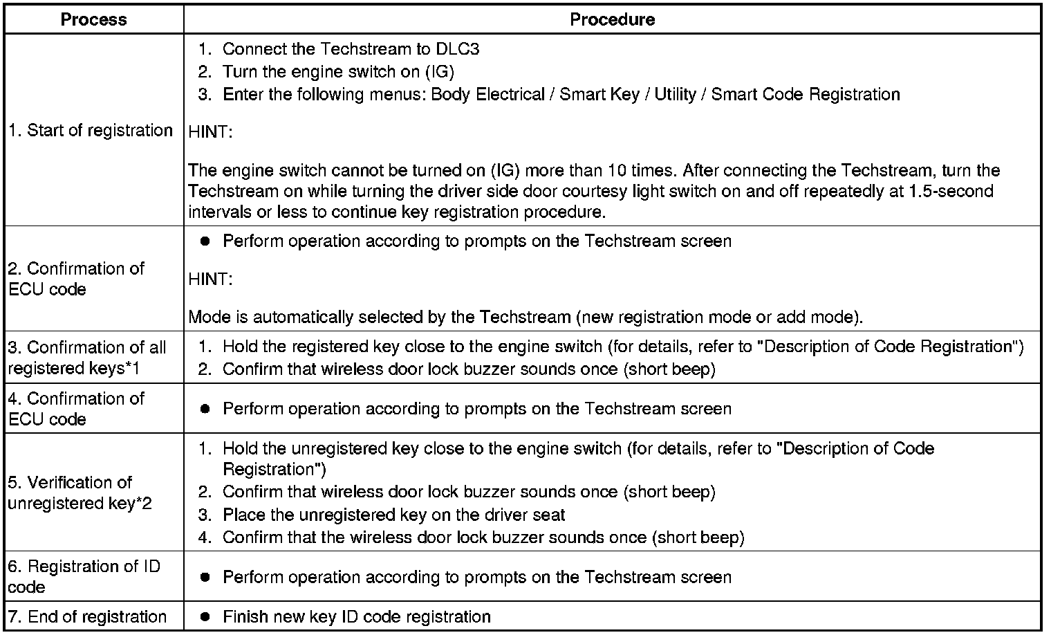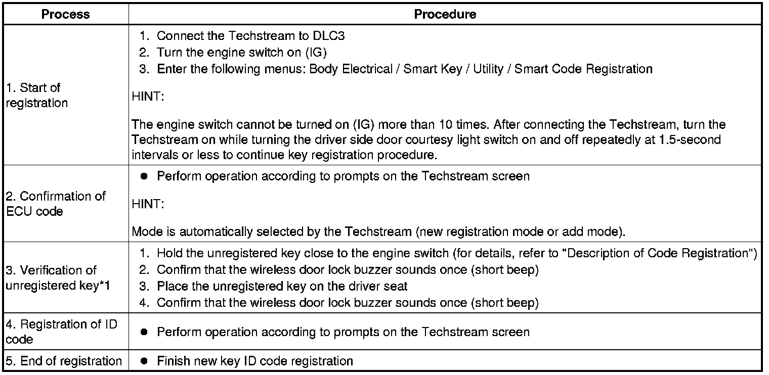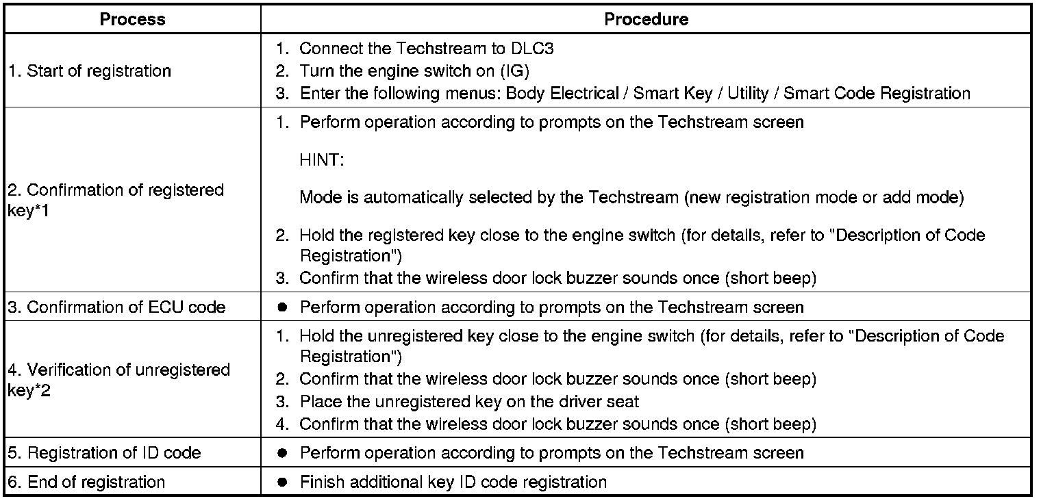 *1: Perform this process for one of the keys registered for the vehicle. Finish the procedure within 30 seconds. If the procedure has not been finished within the specified time, perform the registration procedures again from process 1.