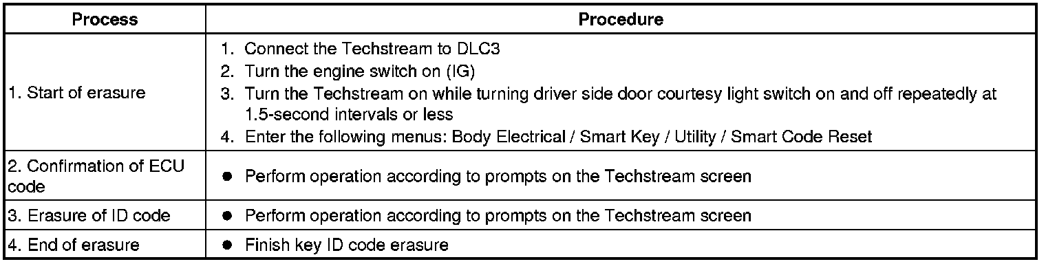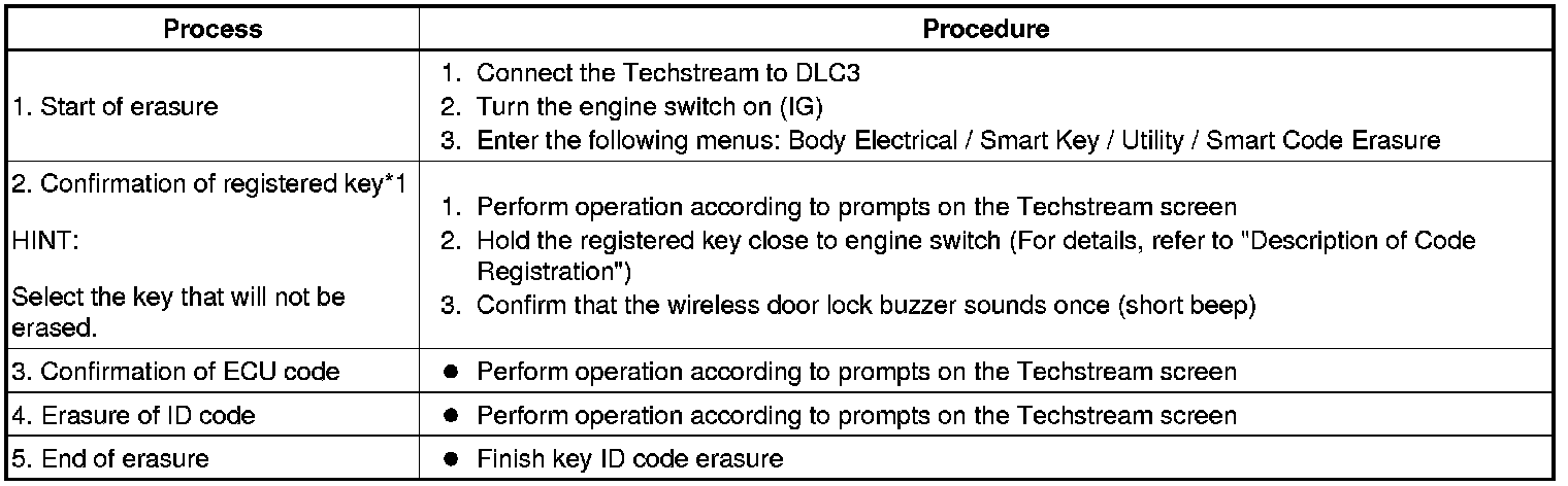 *1: Perform this process for one of the keys registered for the vehicle. Finish the procedure within 30 seconds. If the procedure has not been finished within the specified time, perform the erasure procedures again from process 1.