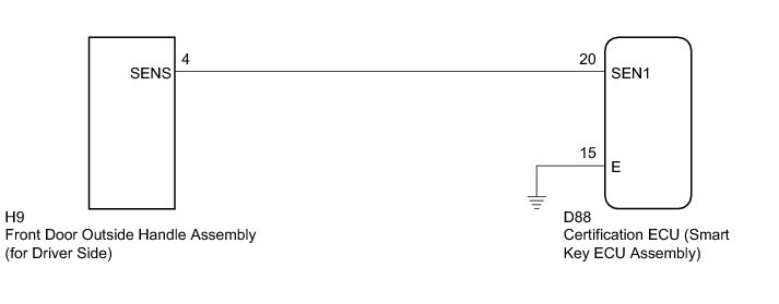 If the driver door entry lock function operates normally, but its entry unlock function does not, this means that the request code from the driver door is being output normally. In this case, a malfunction in the touch sensor circuit (from the certification ECU (smart key ECU assembly) to the front door outside handle assembly (touch sensor)) is suspected.