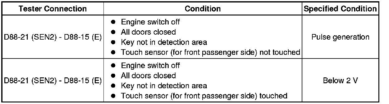 If the front passenger door entry lock function operates normally, but its entry unlock function does not, this means that the request code from the front passenger door is being output normally. In this case, a malfunction in the touch sensor circuit (from the certification ECU (smart key ECU assembly) to the front door outside handle assembly (touch sensor)) is suspected.