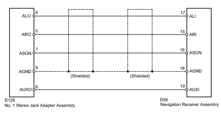 The No. 1 stereo jack adapter assembly sends an external device sound signal to the navigation receiver assembly through this circuit.