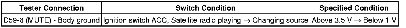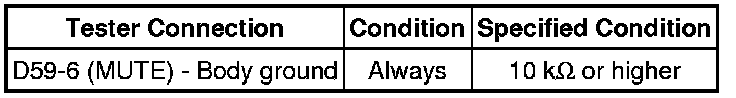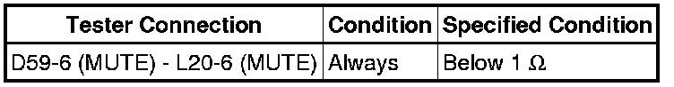 The MUTE signal is sent to reduce noise and a popping sound generated when switching the mode etc. If there is an open in the circuit, noise can be heard from the speakers when changing the sound source. If there is a short in the circuit, even though the navigation receiver assembly is functioning normally, no sound or only an extremely faint sound can be heard.