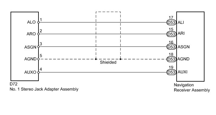The No. 1 stereo jack adapter assembly sends an external device sound signal to the navigation receiver assembly through this circuit. The sound signal that has been sent is amplified by navigation receiver assembly, and then is sent to speakers.