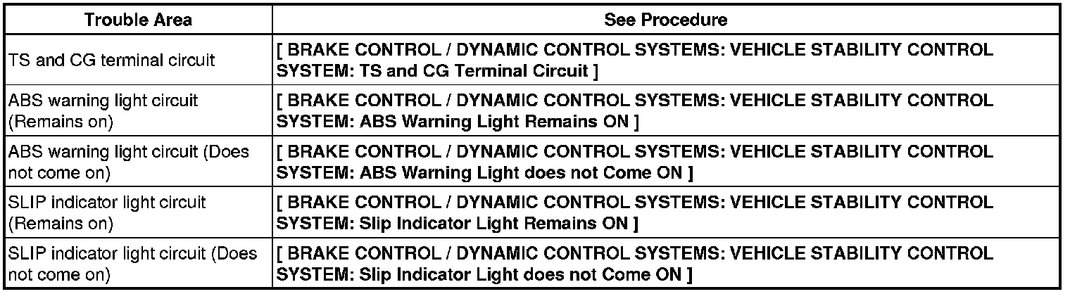 If the ABS warning and SLIP indicator lights do not blink, inspect the TS and CG terminal circuit and ABS warning and SLIP indicator light circuits.