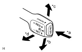 The cruise control main switch operates 7 functions: SET, - (COAST), TAP-DOWN, RES (RESUME), + (ACCEL), TAP-UP, and CANCEL. The SET, TAP-DOWN, and - (COAST) functions, and the RES (RESUME), TAP-UP, and + (ACCEL) functions are operated with the same switch. The cruise control main switch is an automatic return type switch which turns on only while operating it in the direction of each arrow and turns off after releasing it. The internal contact point of the cruise control main switch is turned on with the switch operation. Then the ECM reads the voltage value that has been changed by the switch operation to control SET, - (COAST), RES (RESUME), + (ACCEL), and CANCEL.