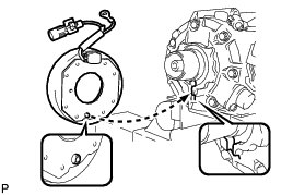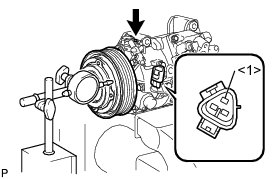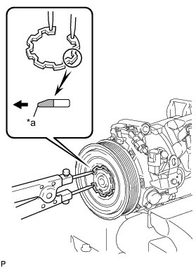 (a) Install the magnetic clutch stator while aligning the protrusion on the stator with the notch on the air compressor assembly as shown in the illustration.