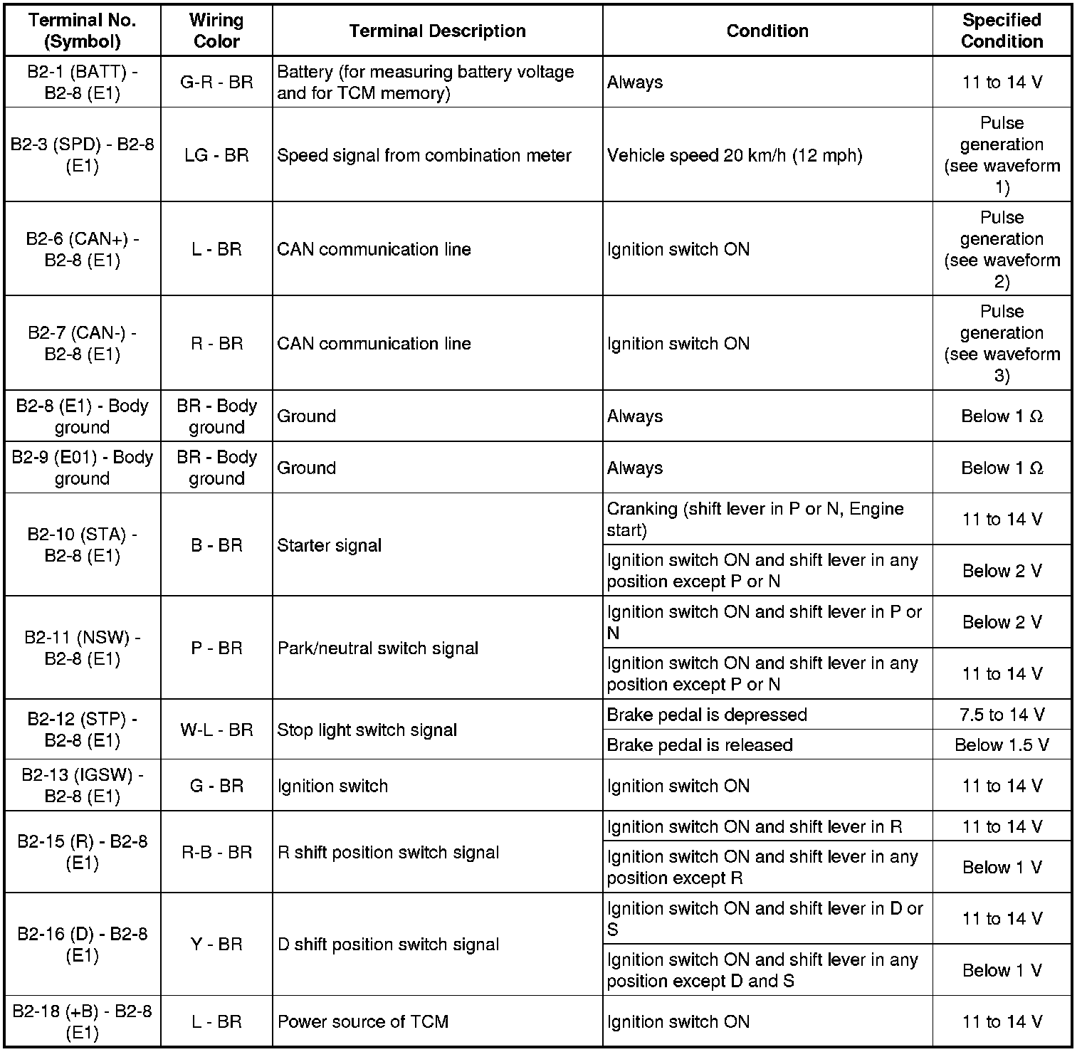 In the table, first follow the information under "Condition". Look under "Terminal No. (Symbol)" for the terminals to be inspected. The standard voltage between the terminals is shown under "Specified Condition".