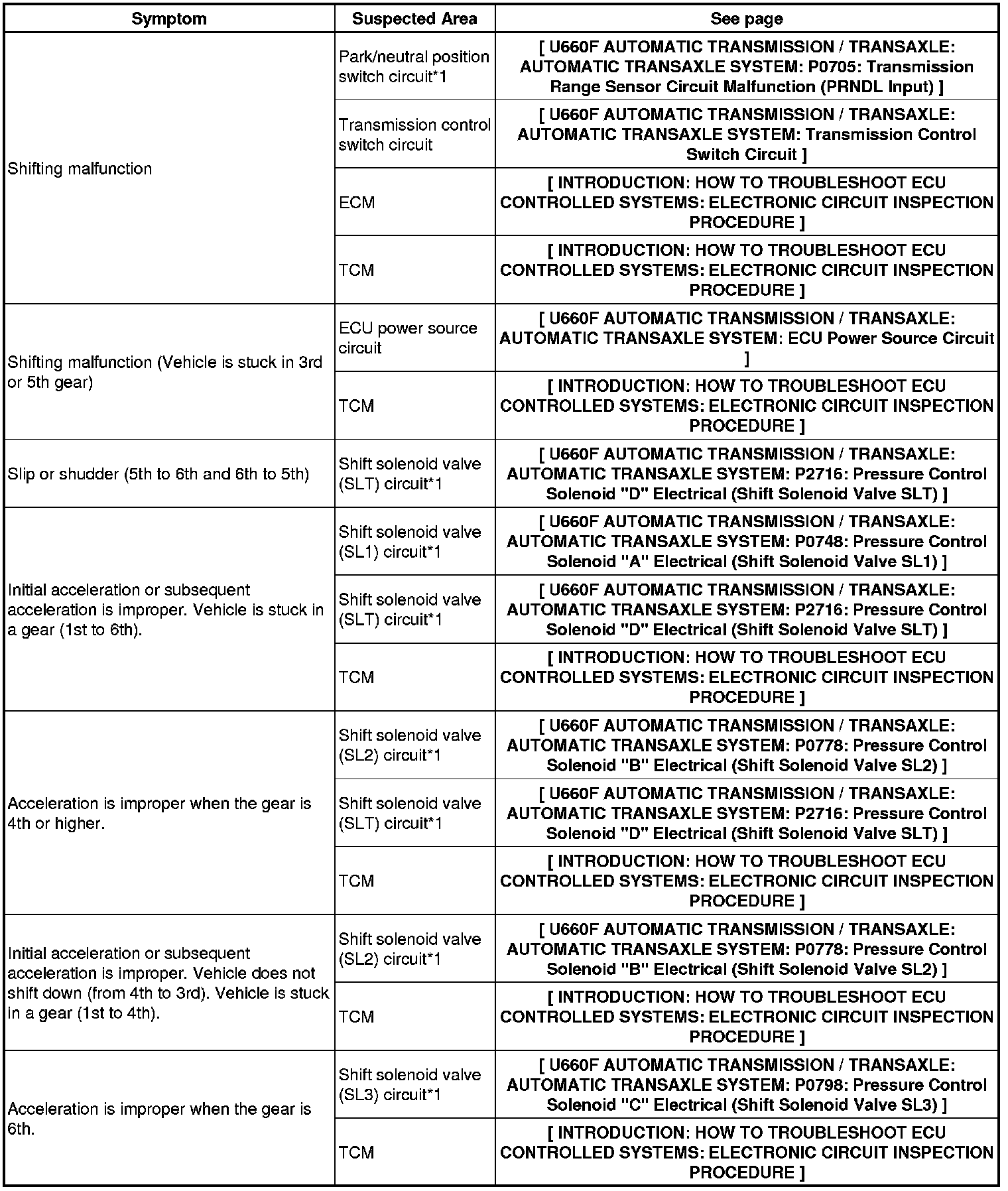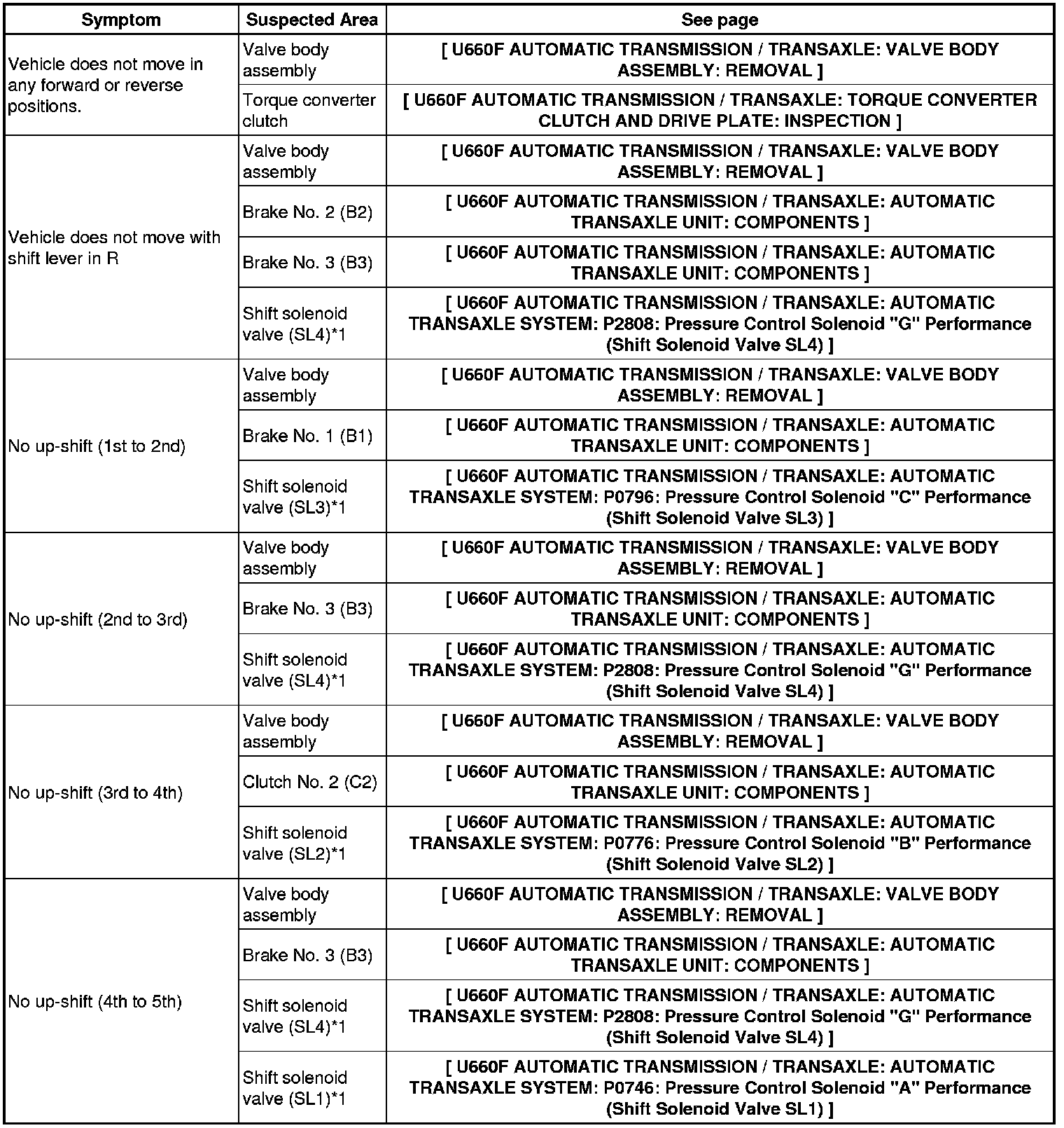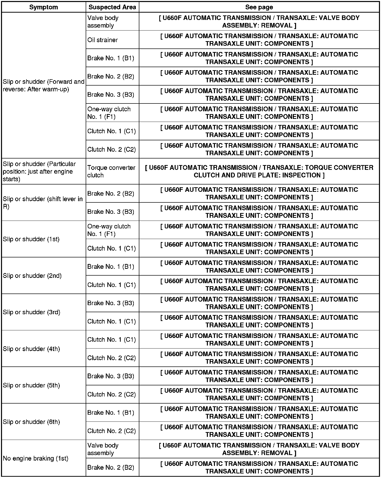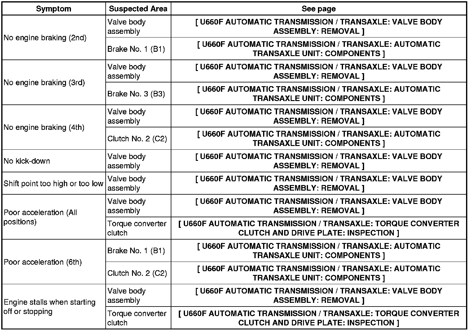 U660F AUTOMATIC TRANSMISSION / TRANSAXLE: AUTOMATIC TRANSAXLE SYSTEM: PROBLEM SYMPTOMS TABLE